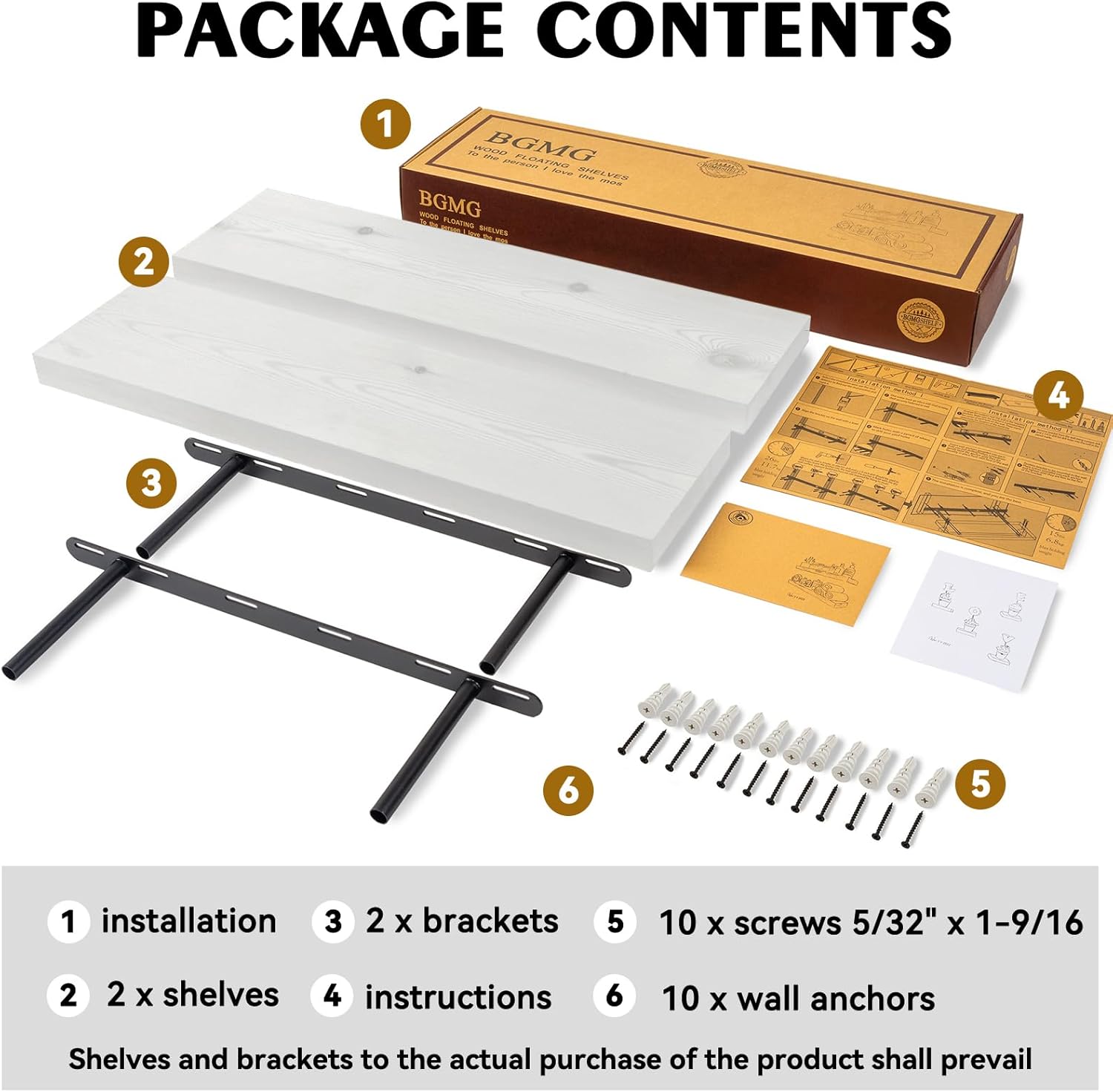 • EASY TO INSTALL: These floating shelves come with stainless steel galvanized invisible brackets, toggle bolts for drywall, and simple instructions to help you install them. These wall shelves are easy to assemble, requiring only two boards and the necessary screws and hardware. We also provide detailed instructions for quick and easy assembly