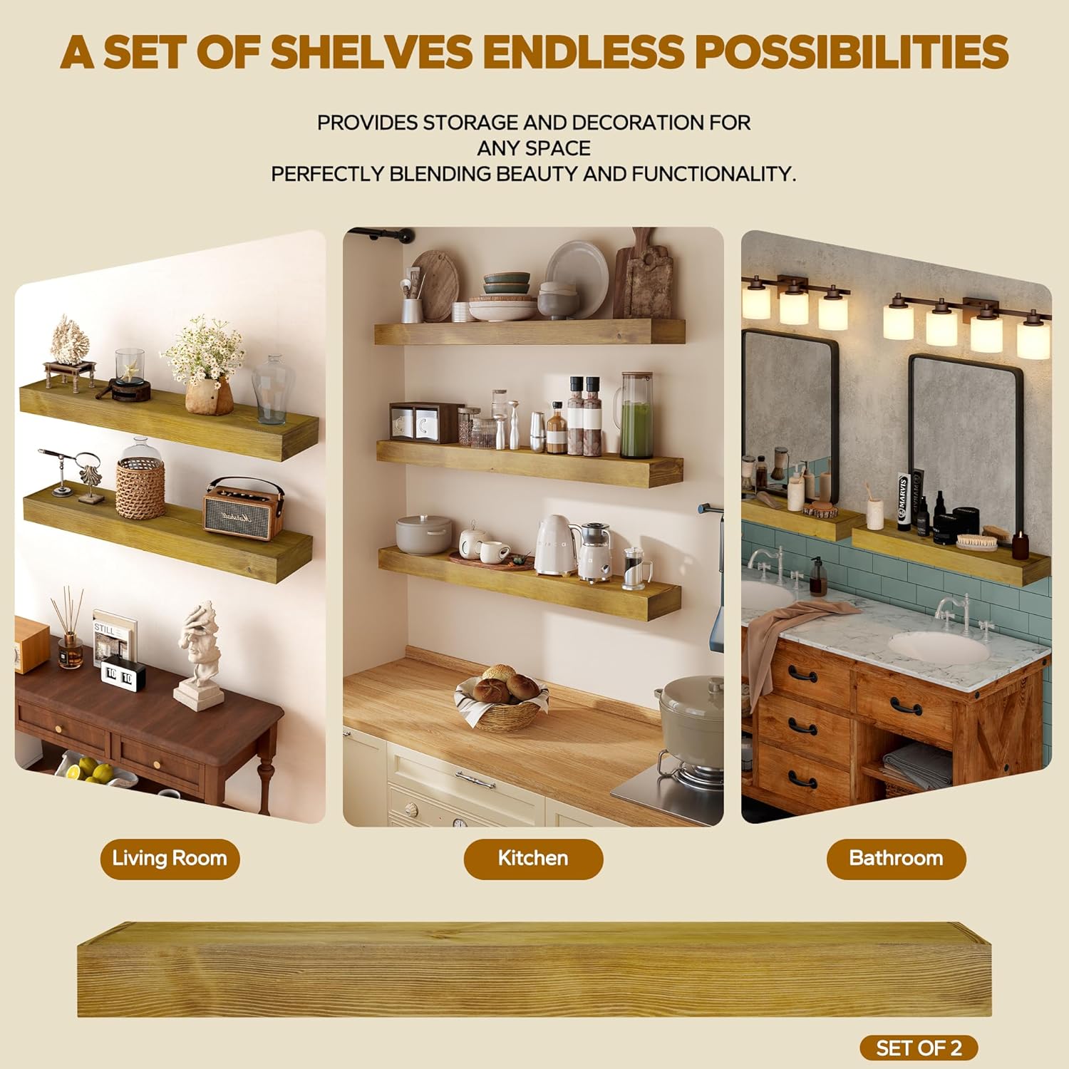 • Stylish and Versatile Storage Solution: Upgrade your living spaces with these 3'' thick rustic wood shelves, perfect for kitchens, bedrooms, bathrooms, living rooms, or offices. They combine rustic charm with modern functionality, serving as both decorative and practical storage.