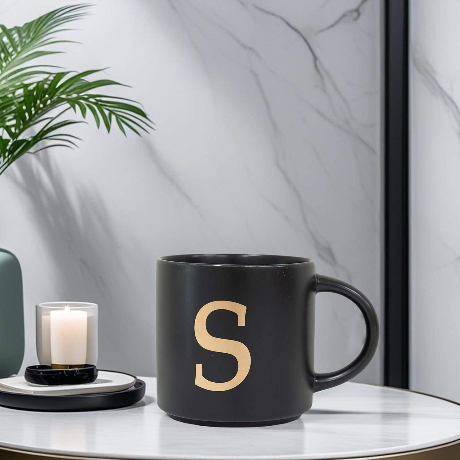 COLLECTIVE HOME - Monogram Ceramic Mugs, 15 oz Golden Initial Black Coffee Cups, Elegant Alphabet Tea Mugs, Elegant Personalized Mug with Gift Box, Unique Mug with Double Side Capital Lette (S)