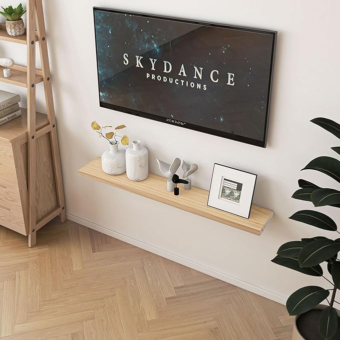 • Extra Deeper & Thicker for Storage - Each board measures 48"W x 8"D x 1.4"H. Extra deeper and thicker design in order to bring maximizes storage space and weight capacity, even hold up to 60 lb. This floating shelf taking up zero square feet, reduces clutter and highlights décor in compact spaces. It can help make full use of the empty wall, making it much more space-saving and making your room look larger and tidier.