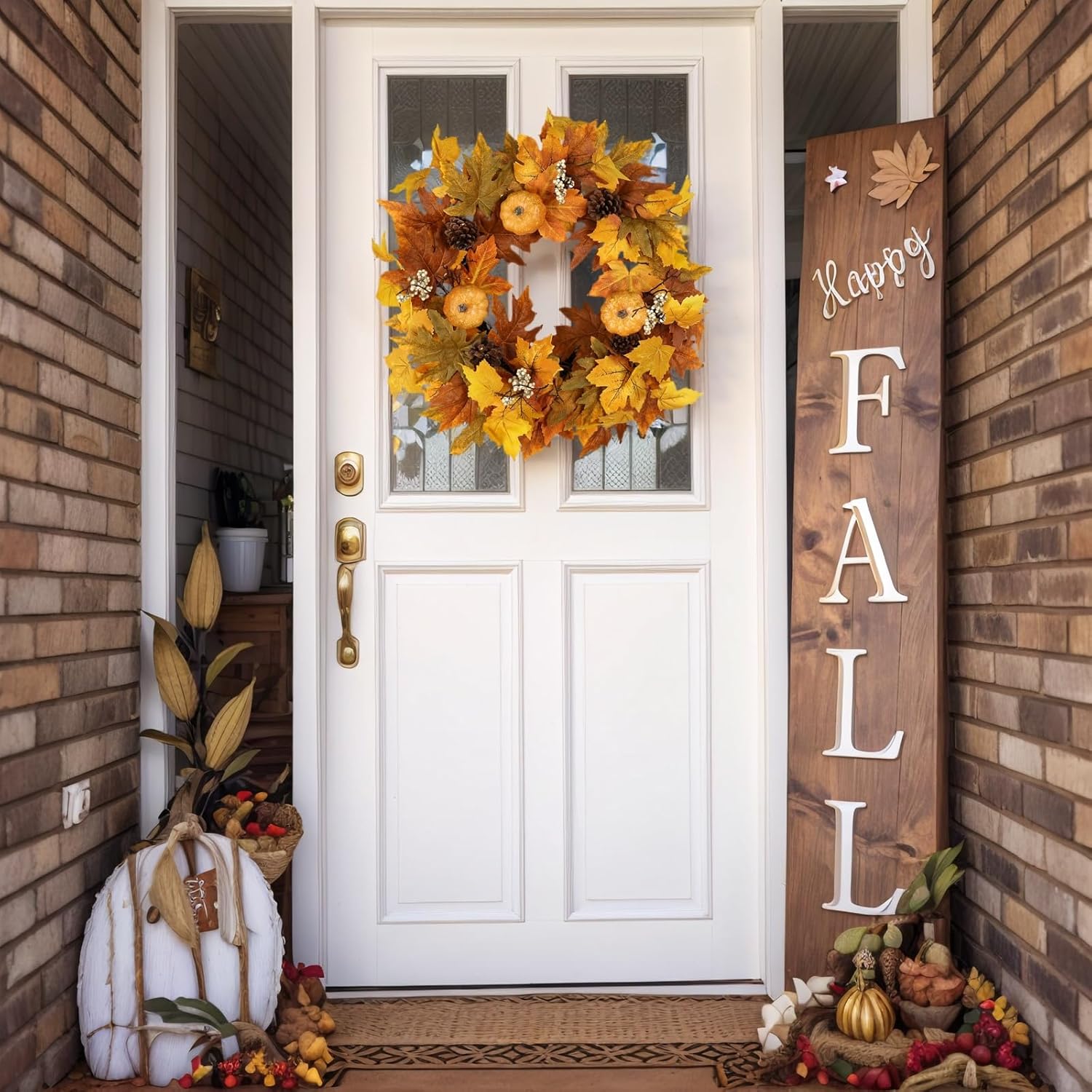 • 【Fall Decorations for Home】With autumn comes Halloween and Thanksgiving-occasions to enhance your home décor. This artificial autumn wreaths for front door adds a festive touch to any space.Suitable for decorating the front door,living room,windows,fireplace,mirrors,kitchen,dining room,front porch,stair railings,weddings,offices,store displays,hotels,indoor and outdoor spaces,farmhouse settings,and more