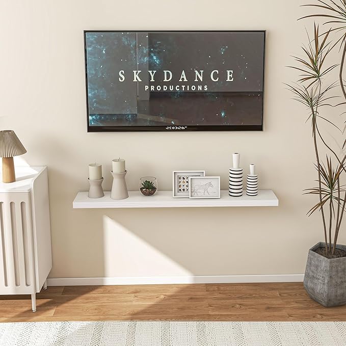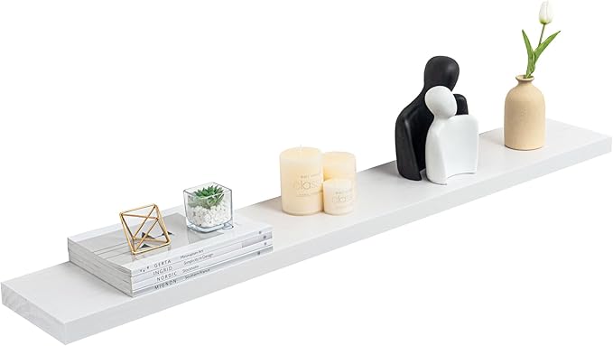 • Extra Deeper & Thicker for Storage - Each board measures 48"W x 8"D x 1.4"H. Extra deeper and thicker design in order to bring maximizes storage space and weight capacity, even hold up to 60 lb. This floating shelf taking up zero square feet, reduces clutter and highlights décor in compact spaces. It can help make full use of the empty wall, making it much more space-saving and making your room look larger and tidier.