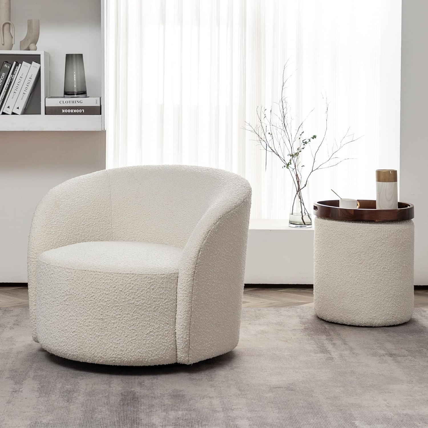 • Package Includes: 1 x boucle swivel barrel chair (Cream, Dimensions: 32.7'' D X 34'' W X 28.5'' H, no assembly); 1 x boucle upholstered ottoman (Cream, Dimensions: 18"D x 18"W x 18.3"H, no assembly). No throw pillow includes in this living room boucle chair ottoman furniture set.