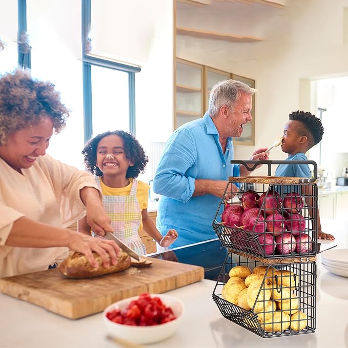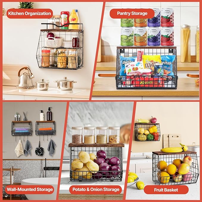 • Wall-mounted and Stackable Metal Storage Basket: This fruit basket for kitchen counter is highly versatile, offering both stackable and wall-mountable options. It includes all necessary hardware (screws and wall anchors) for secure wall mounting, freeing up valuable countertop space. The onion storage basket can be used independently or stacked to maximize space efficiency. Additionally, the top shelf features a high-quality wooden board, providing convenient storage solutions for small items, seasoning organizers, decorations, and daily necessities.