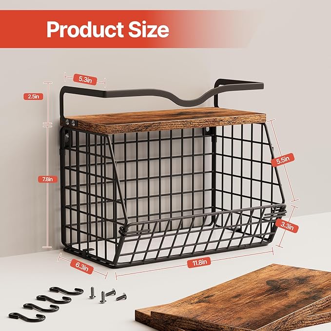• Space-saving Design: Each set includes two black fruit baskets, measuring 11.8" in × 6.3" in × 8.6" in . These dimensions ensure minimal countertop space usage. The wooden lids on the top of the hanging storage baskets provide additional storage capacity while maintaining an organized appearance. The included hooks allow for hanging small items, further enhancing space-saving functionality.