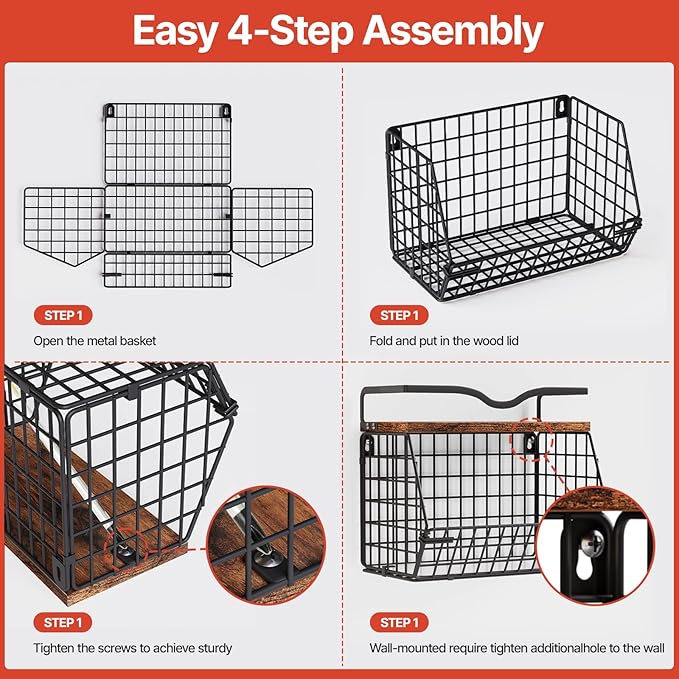 • Easy Assembly: Following the detailed instructions provided, assembly is straightforward and hassle-free. The black metal components are unfolded into their correct shapes, secured with built-in clips, and fastened to complete the metal base. The top wooden board is then fixed with three screws using the included tools. Both baskets can be fully assembled within five minutes, resulting in a sturdy and visually appealing structure.