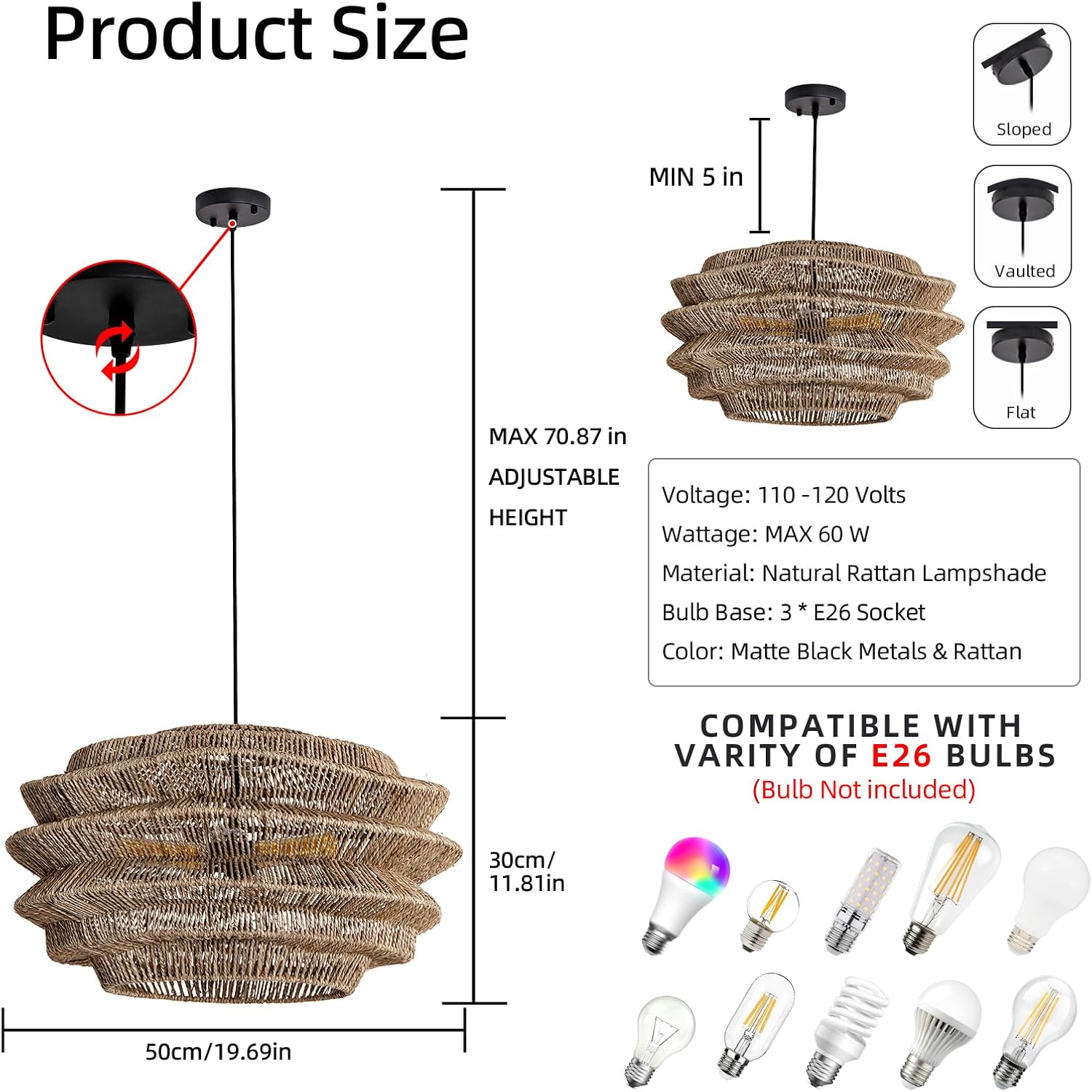 • 【 Light Size&Bulb Requirement】3-Light rattan pendant light, Size:D 50 *H 30 cm/ D: 19.7" * H: 11.81"".Voltage: 110v~240v, Bulb socket and electric cord have passed the UL listed, which can ensure that you use them safely. US standard E26 base socket, maximum 60W, suitable for Incandescent, LED, halogen, CFL, etc (Bulb Not included)