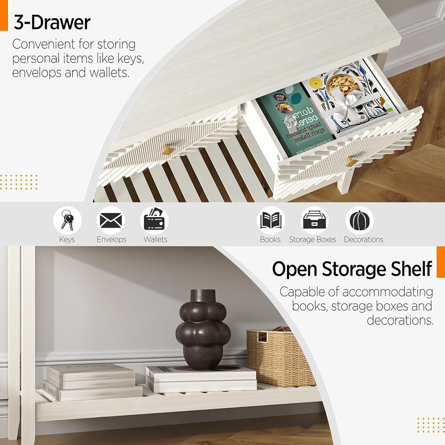 • Reasonable Storage Space: Boasting great storage capacity, this entryway table comprises 3 smooth drawers, 1 spacious tabletop and an ample bottom storage shelf. Daily-use items for going out such as sunglasses, keys, masks, power bank, umbrella and shoes can all be accommodated in order