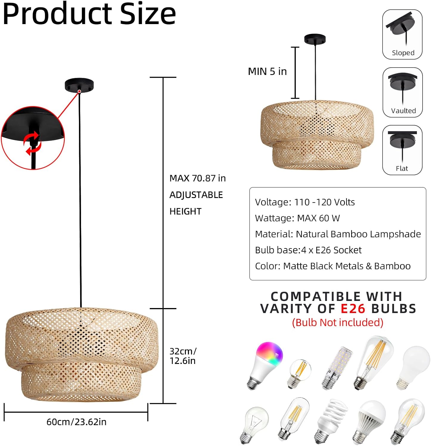 • 【Bulb Requirement】Size 60 * 32 cm, 26.62" * 12.6", Voltage 110v~240v, Bulb socket and electric cord have passed the UL listed, which can ensure that you use them safely. US standard E26 base socket, maximum 60W, suitable for Incandescent, LED, halogen, CFL, etc.(Bulb Not included)