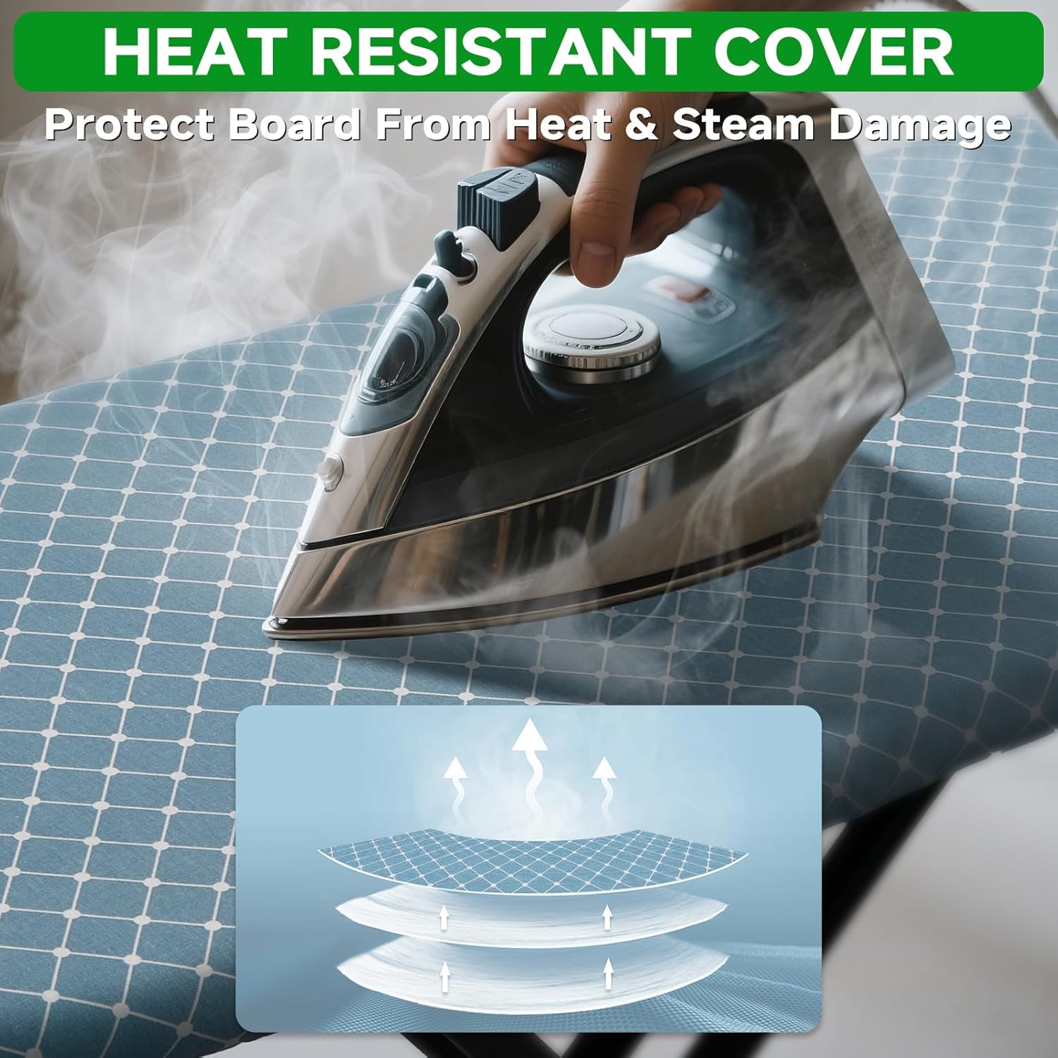 • Heat-Resistant Cover: Features a stylish cross-striped blue cover that is heat and steam resistant, protecting the board from scorching. The breathable metal mesh base enhances steam flow for faster wrinkle removal.