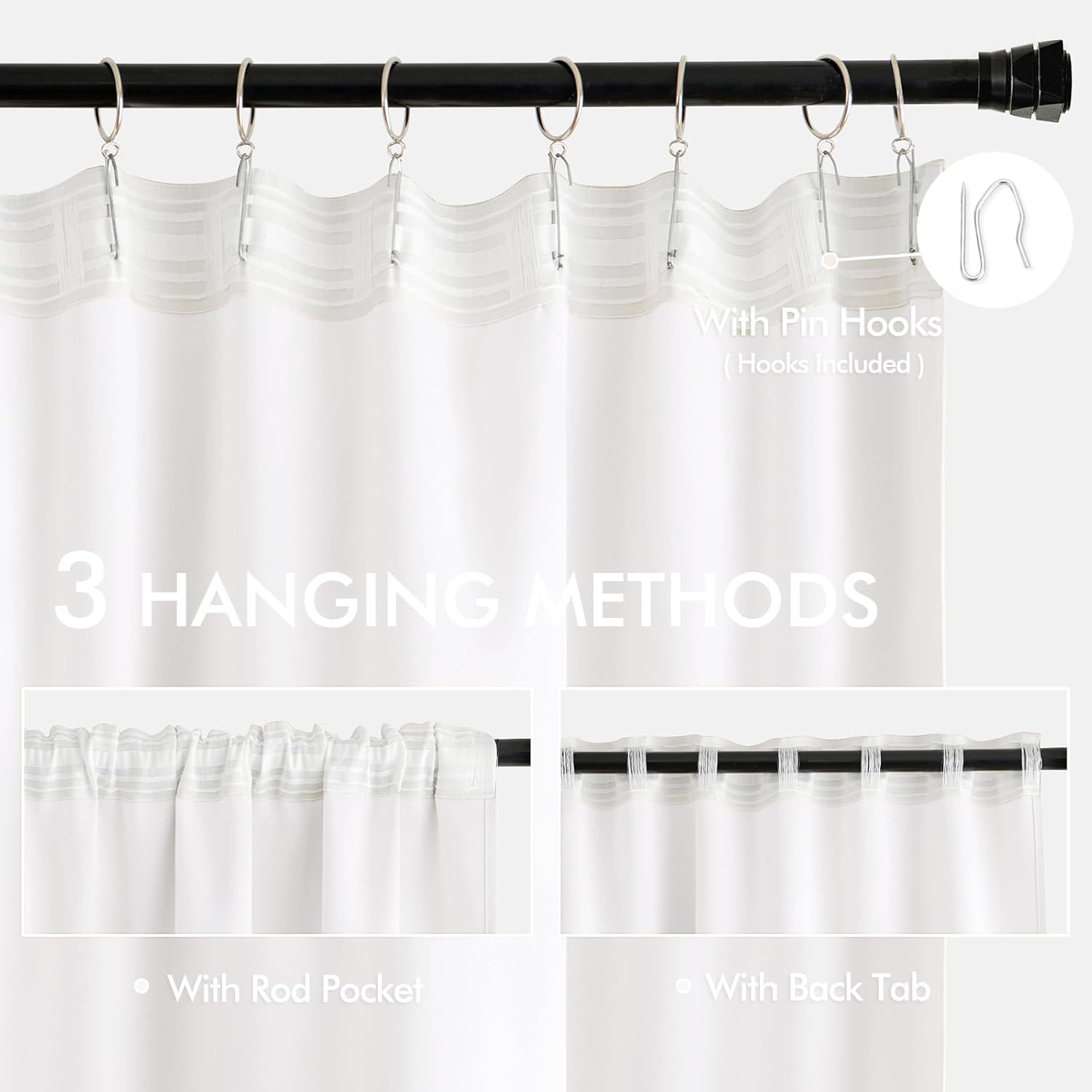 • MULTIPLE HANGING OPTIONS: Each curtain panel features a 3-in-1 top style design: Rod Pocket, Back Tab and Pinch Pleat. The Back loop (2.3 "long) and rod pocket (3.1" long) fit most standard rods. Curtains also can be hung with clip rings or different type of hooks. We will give away 20 pin hooks for each pair of curtains for your convenience (rings won't be included). 3 ways to meet your various needs.