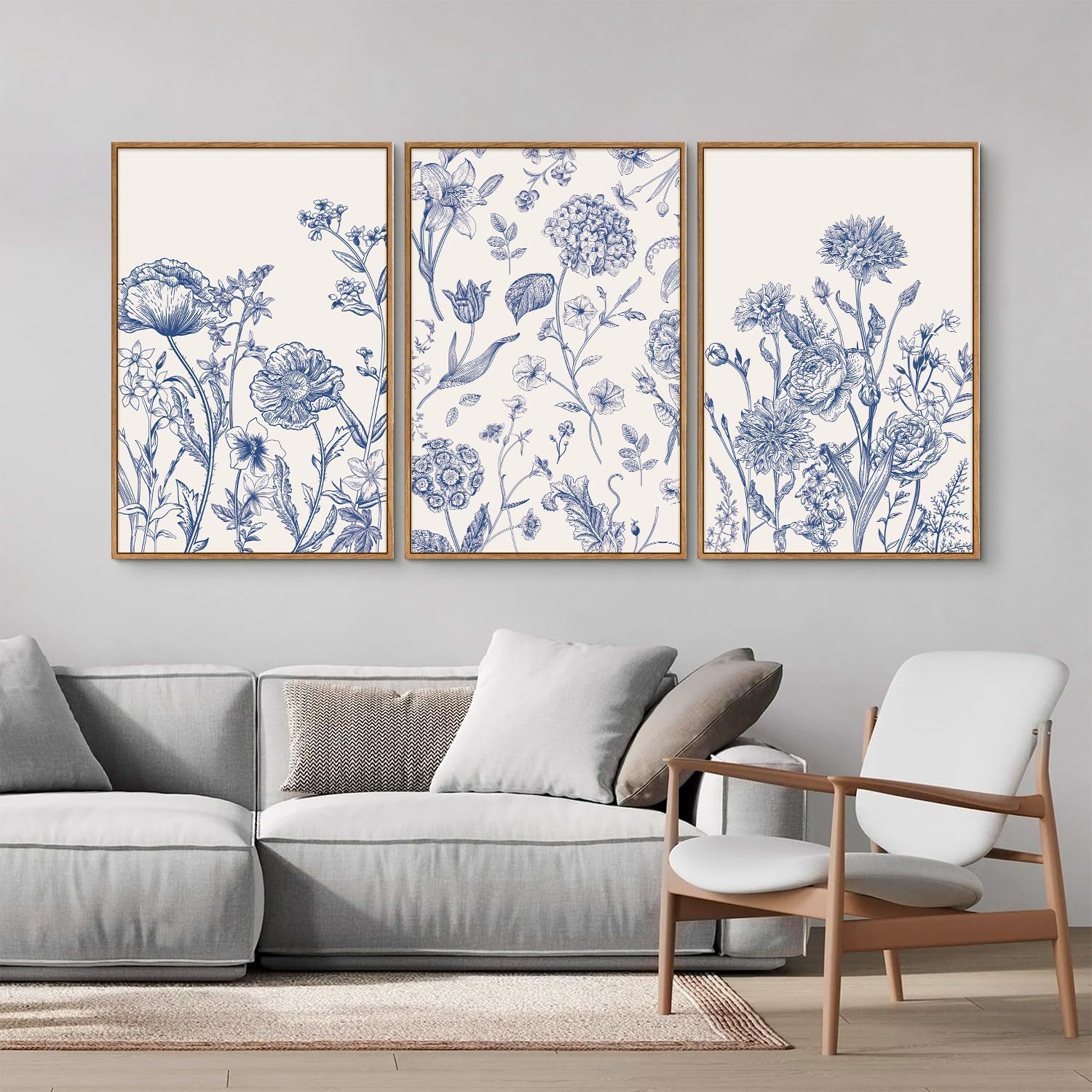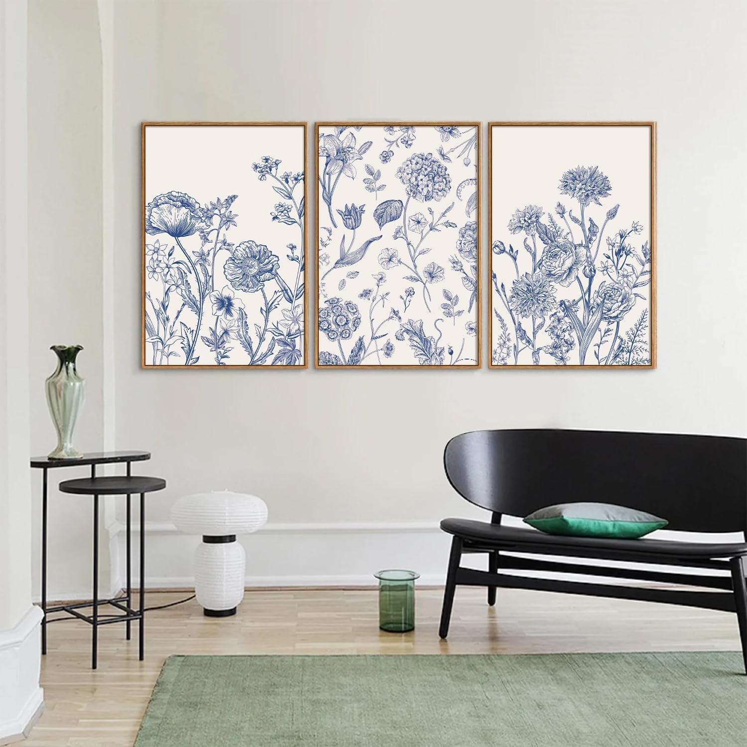 Tinonedraw Large Classic Chinoiserie Flower Framed Canvas Wall Art Set, Navy Blue and White Floral Wall Decor, Minimalist Neutral Botanical Art Printing for Living Room Bedroom Office Dorm 16"x24"x3