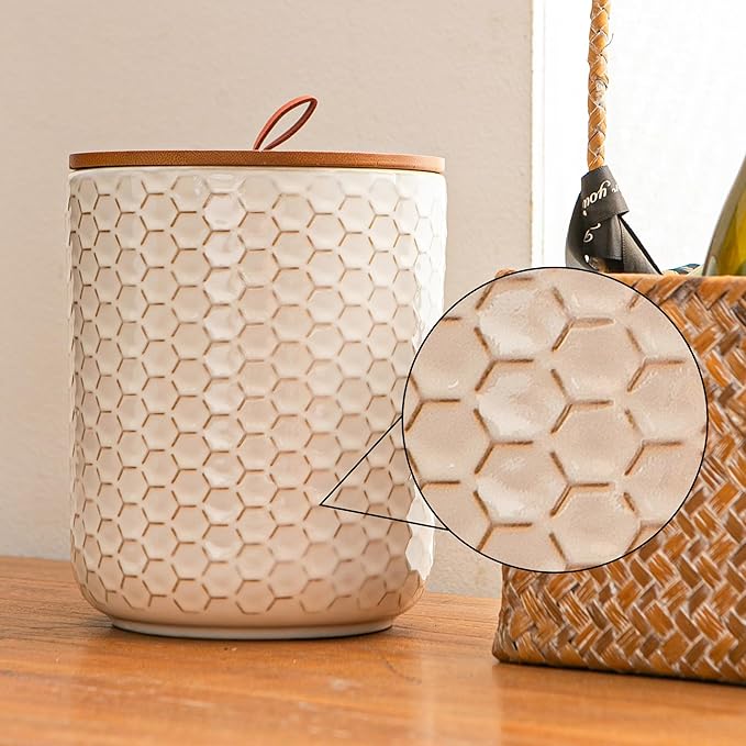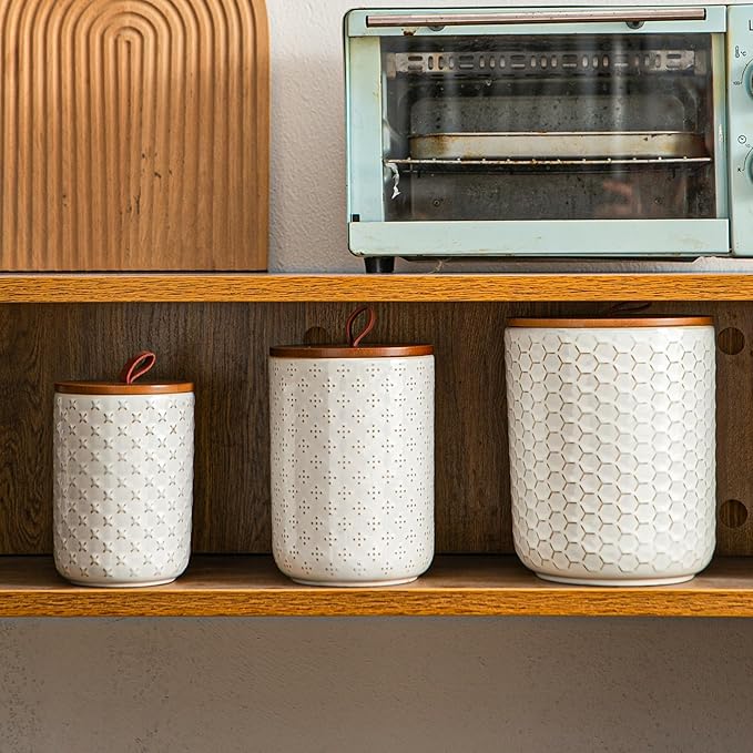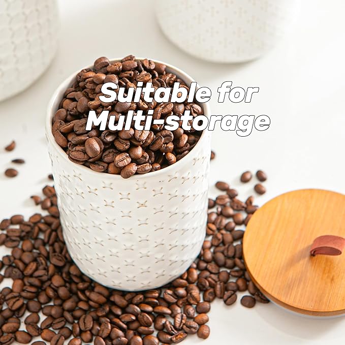 • Airtight Seal with Embossed Elegance - Made from durable white ceramic with embossed surfaces and bamboo lids, each jar includes a silicone ring that helps seal in freshness while keeping out air and moisture—preserving both taste and texture.