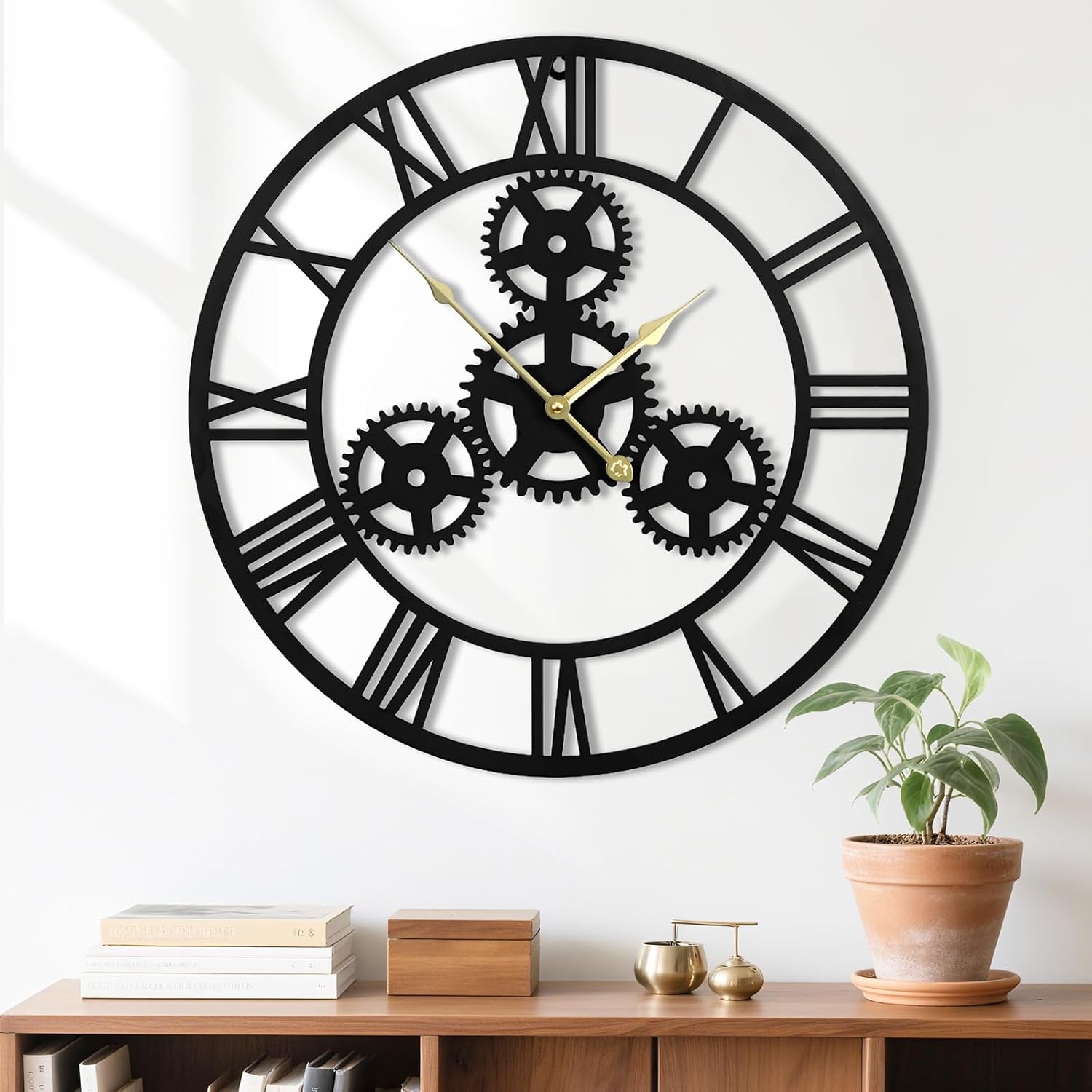 • Black Metal Wall Clock: 24-inch diameter wall clock for living room is made of Metal, industrial-style gear mechanisms and Roman numerals and the thicken frame is very strong and sturdy.It's not only a large clock ,but also a great iron art work.High quality wall clock movement offers you more peaceful moments!The rear slot design is easy to hang as well,