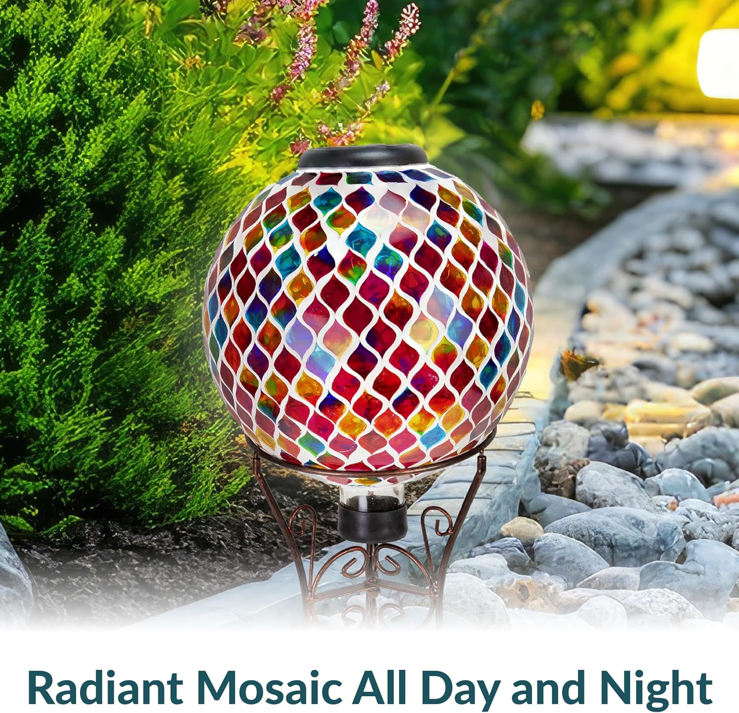 • ADD VIBRANT COLOR TO OUTDOOR SPACES: The gazing globe ball is made from glass with a unique mosaic design. Several beautiful shades will add style to the garden, on the patio, or in flower beds.