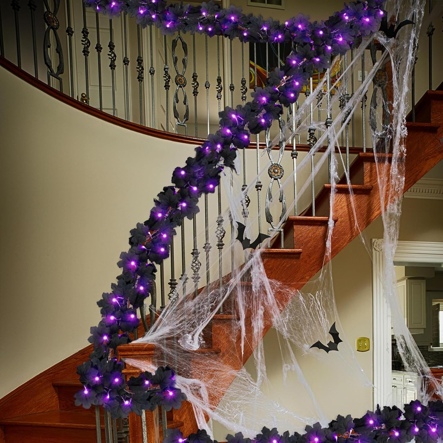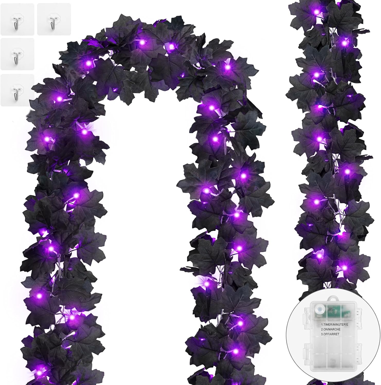 • Package: 2 pack 10 ft lighted black garland; Each garland has 30 purple lights and 60 artificial maple leaves; It can be placed anywhere to shows a mysterious atmosphere, which is definitely a fantastic addition to festival decoration