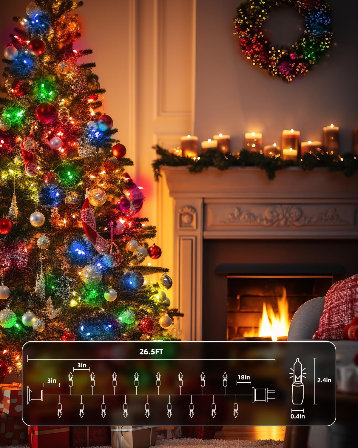 • 【Festive Mini Christmas Lights Set】This set includes 100 mluticolored incandescent mini-lights on 26.5 ft white wire, with bulbs spaced 3-inche apart and 18-inch lead wire. Perfect for holiday decorating, with the ability to connect up to 5 light strings end-to-end;