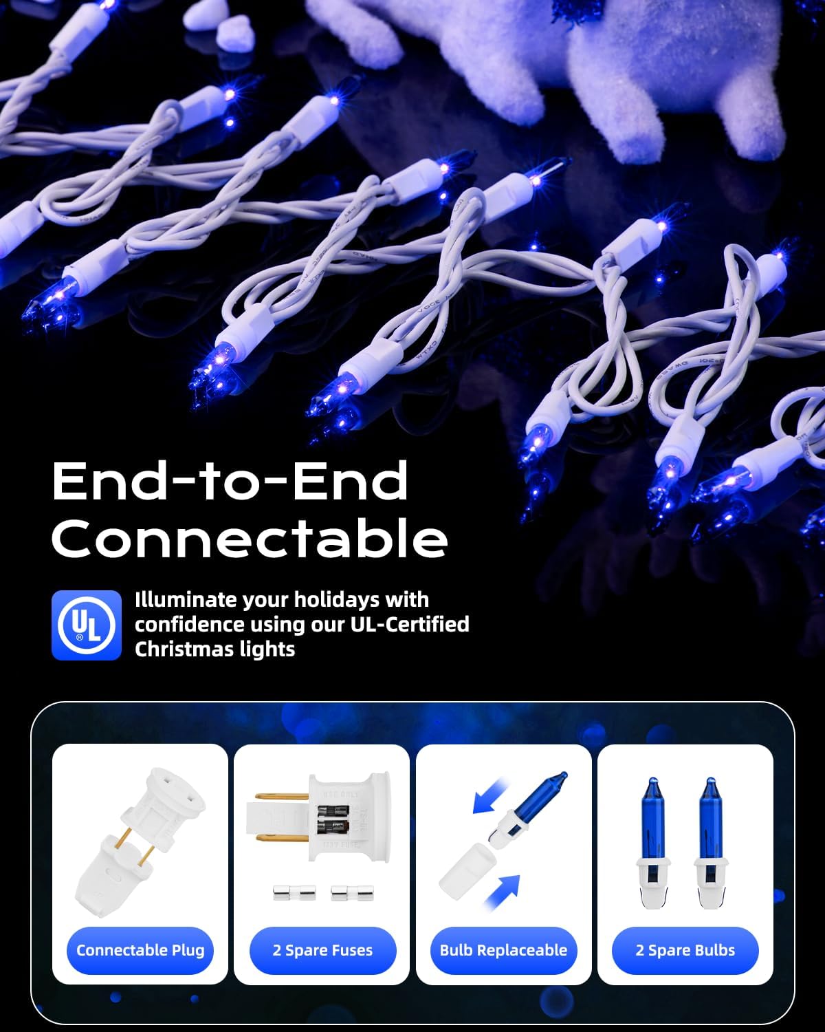 • 【Festive Mini Christmas Lights Set】This set includes 100 blue incandescent mini-lights on 26.5 ft white wire, with bulbs spaced 3-inche apart and 18-inch lead wire. Perfect for holiday decorating, with the ability to connect up to 5 light strings end-to-end;