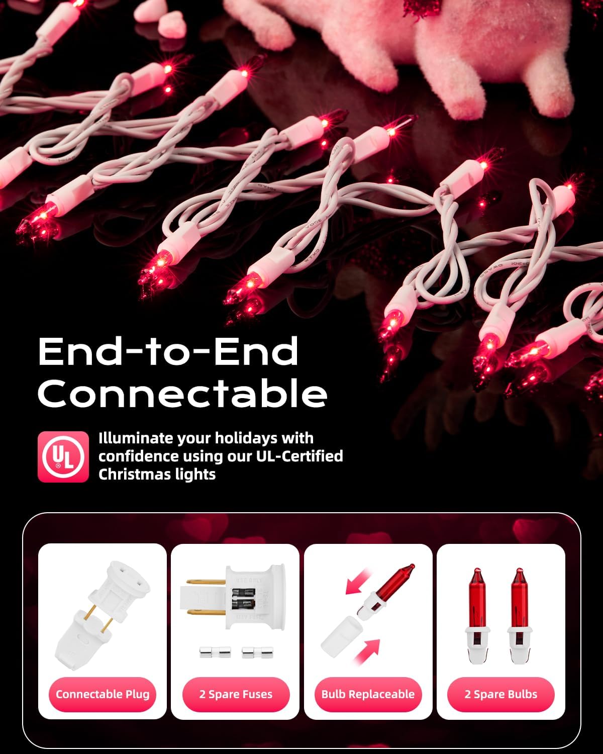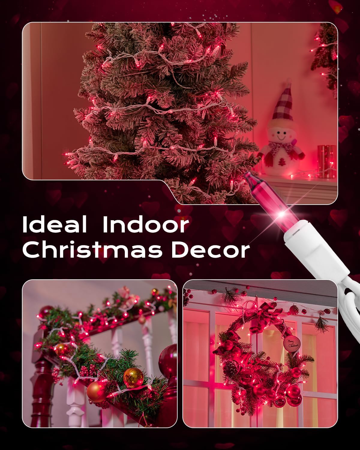 • 【Festive Mini Christmas Lights Set】This set includes 100 pink incandescent mini-lights on 26.5 ft white wire, with bulbs spaced 3-inche apart and 18-inch lead wire. Perfect for holiday decorating, with the ability to connect up to 5 light strings end-to-end;
