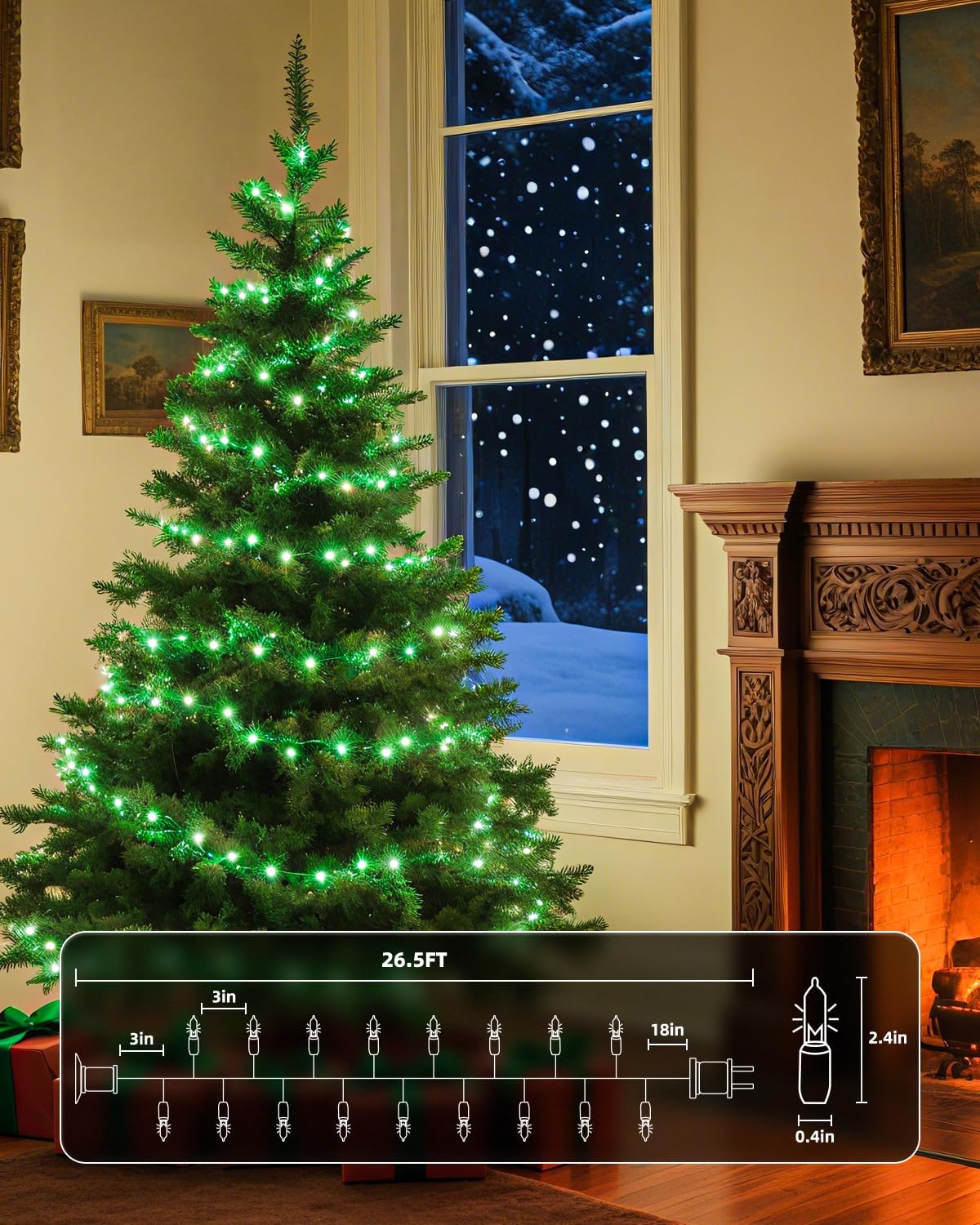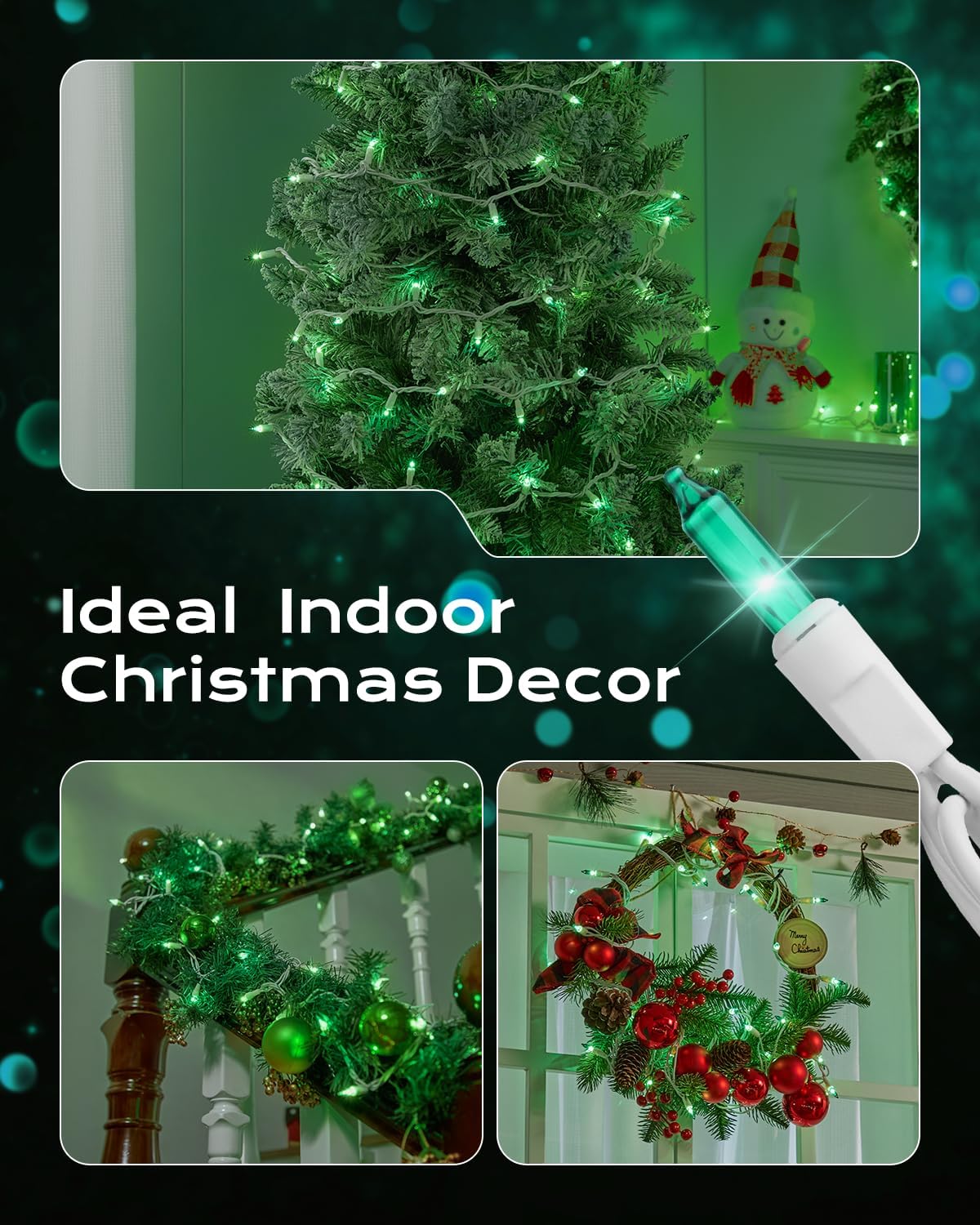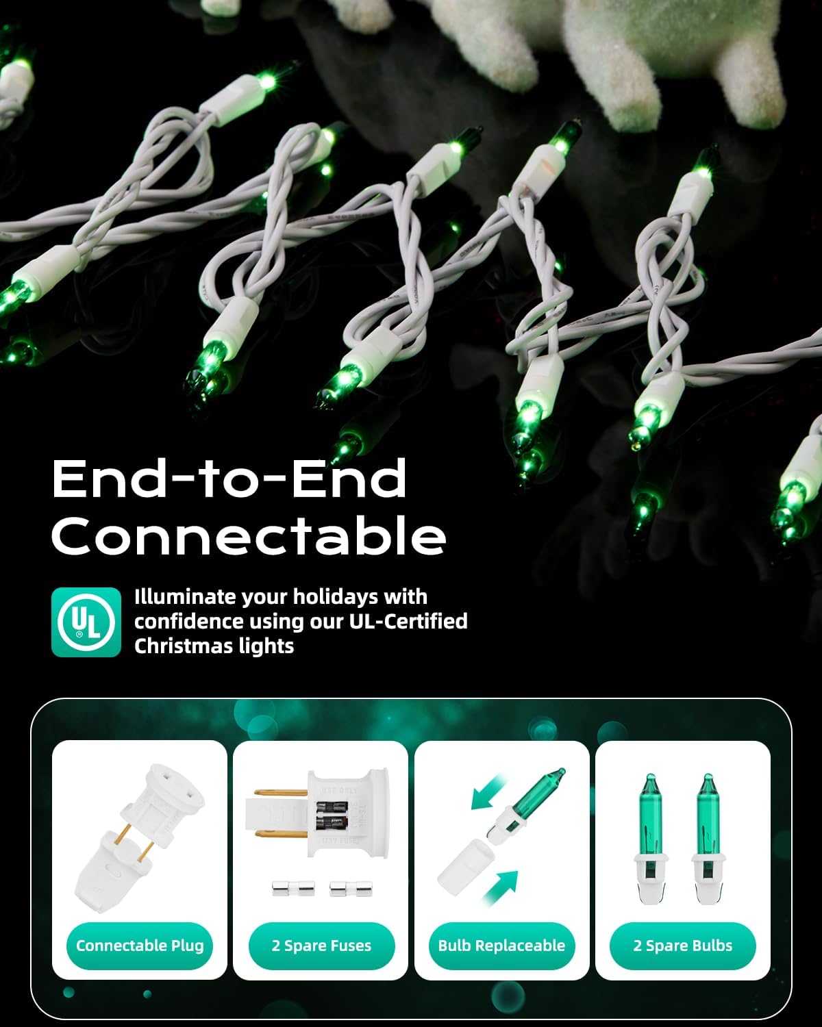 • 【Festive Mini Christmas Lights Set】This set includes 100 green incandescent mini-lights on 26.5 ft white wire, with bulbs spaced 3-inche apart and 18-inch lead wire. Perfect for holiday decorating, with the ability to connect up to 5 light strings end-to-end;