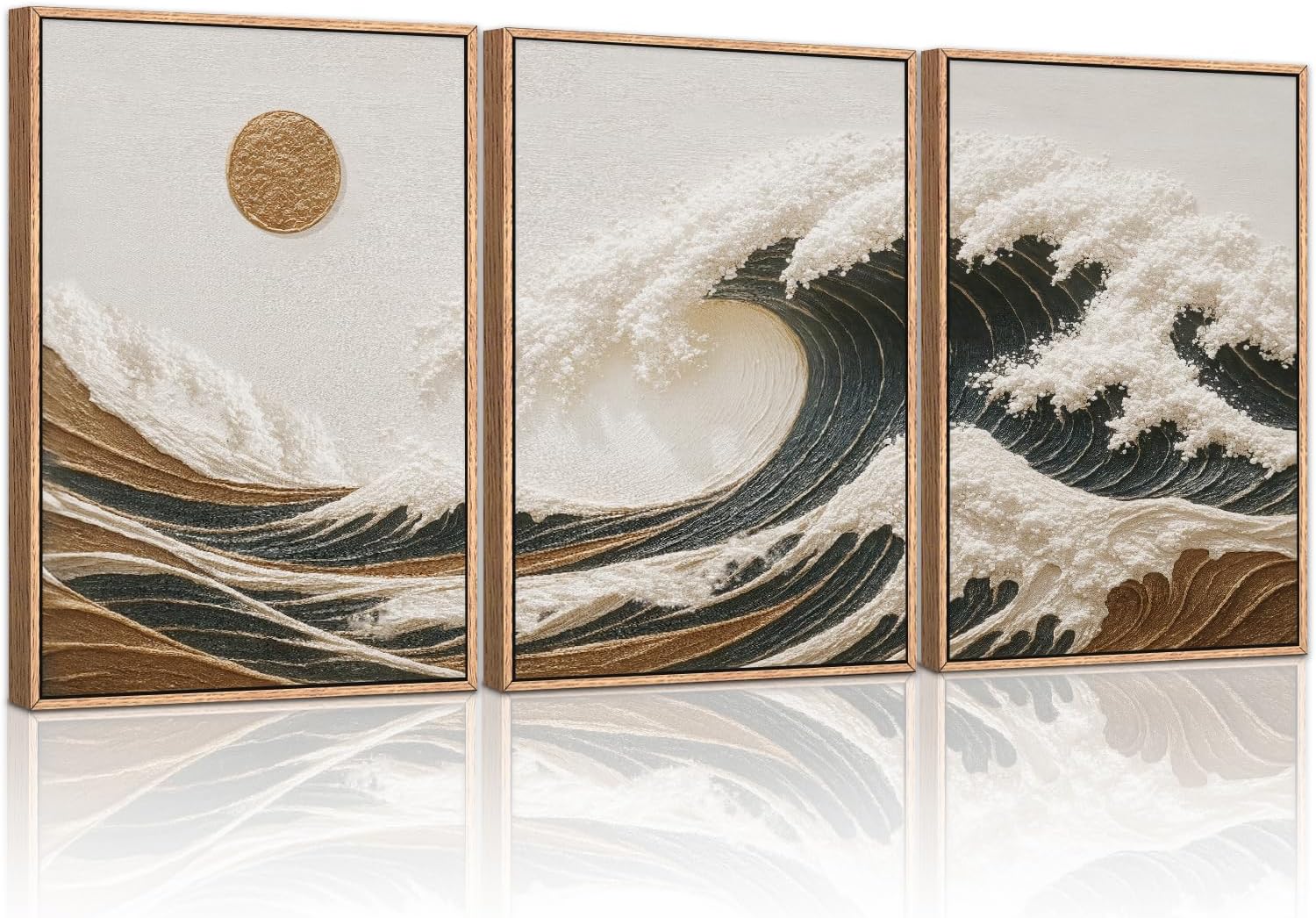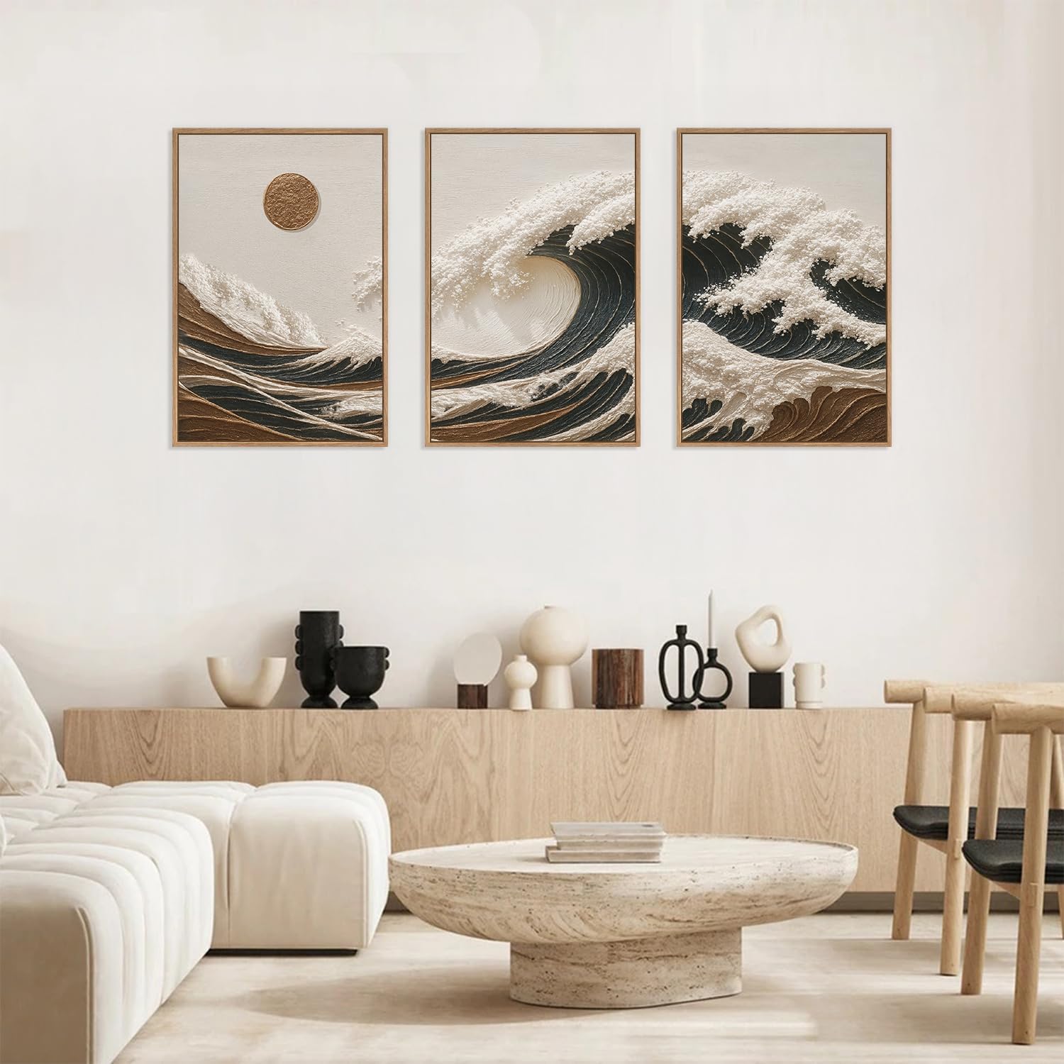 • 【Ocean Waves Wall Art】Elevate the atmosphere of your home with the HLNIUC ocean waves decorative paintings, featuring an artistic atmosphere and modern style, with a soft and retro overall tone, and the cleverness of the waves and the sun gave your space a unique stylish yet elegant atmosphere.Each print is expertly framed and ready to hang, making it a focal point in any room.