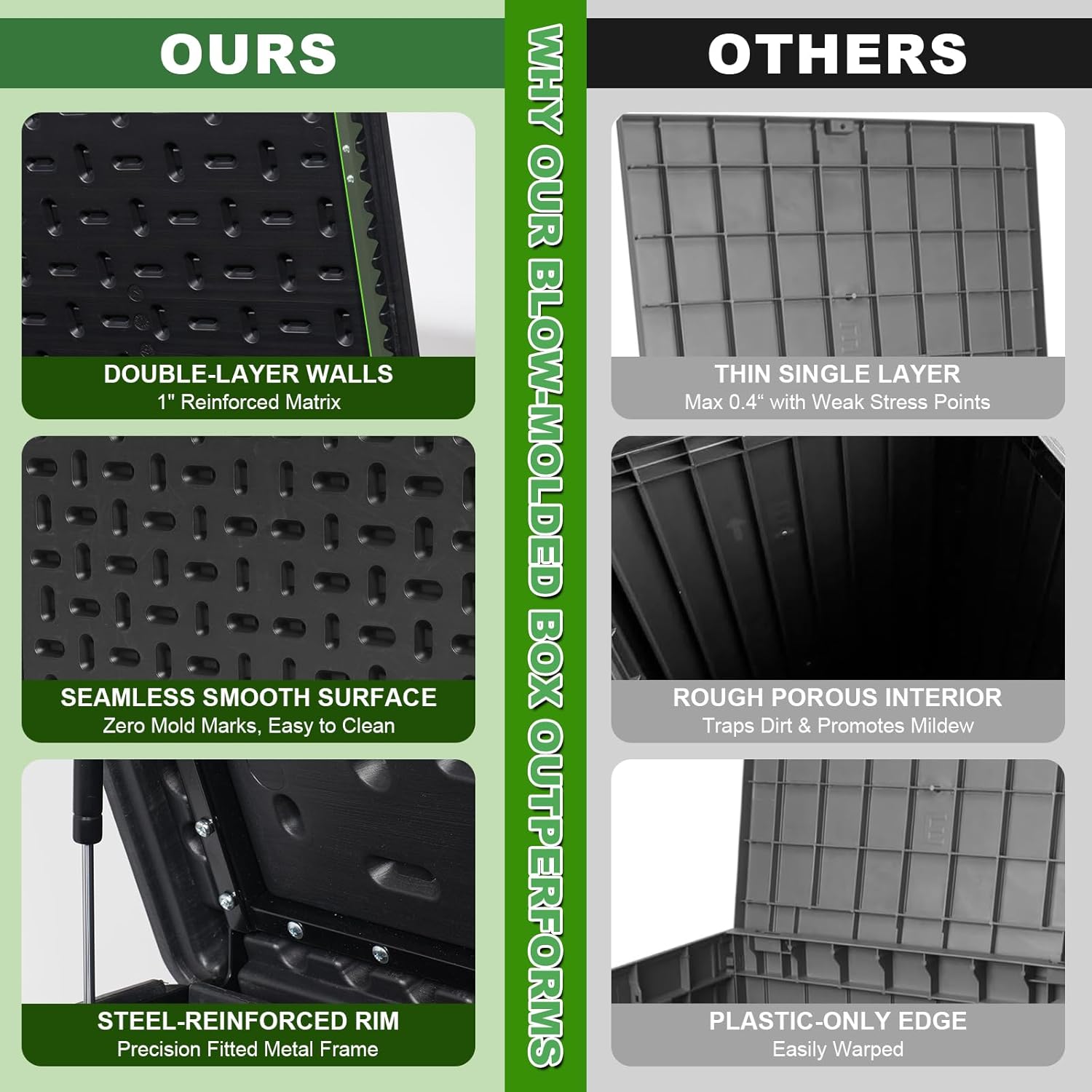 • Heavy-Duty & Sturdy Construction​​: Engineered for durability, our ​​garden storage box clearance​​ resists warping and cracking. Unlike flimsy competitors, its reinforced structure supports heavy loads and doubles as secure seating—ideal for patios, decks, or boat docks.