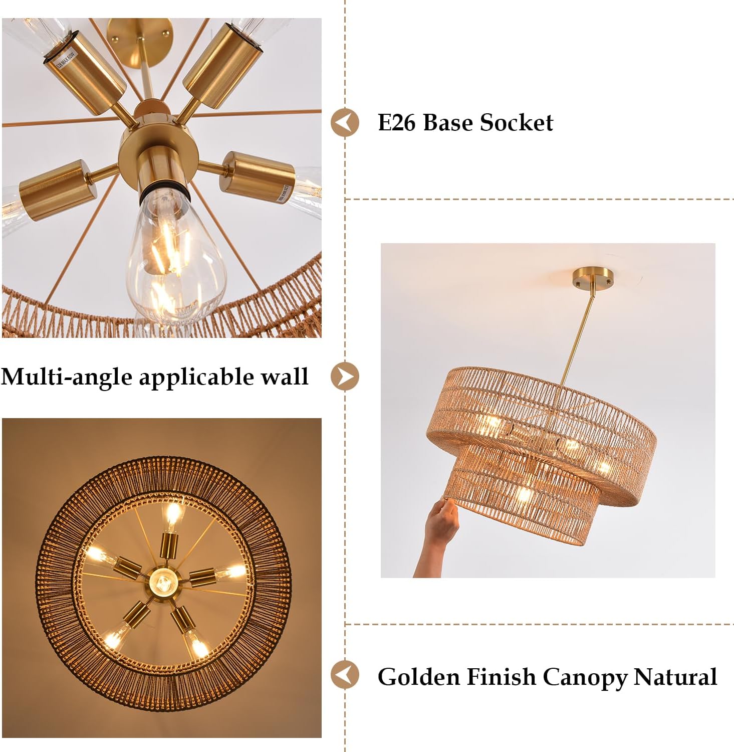 • Boho Chandelier Farmhouse - Boho rattan chandelier is made of natural hand-woven rattan and a sturdy gold metal lamp holder. The light gently filters through the woven rattan, casting beautiful shadows and adding a touch of natural texture to your decor