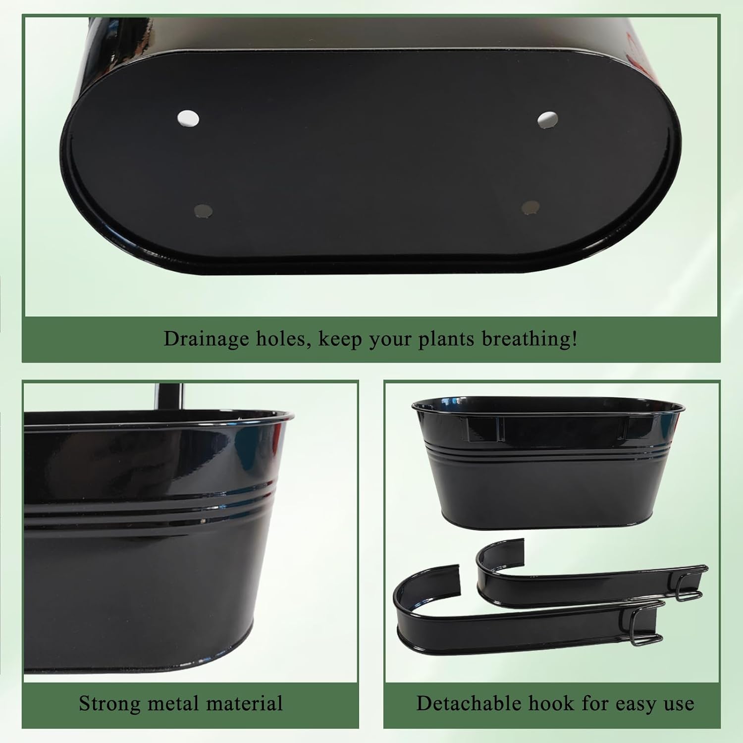 • Detachable Hook & Drainage Hole: The removable hook makes it easy to hang on deck railings, fences, or windows. The drainage hole prevents overwatering, keeping plants healthy. Great for patio planters, herb gardens, or succulents—indoors or outdoors