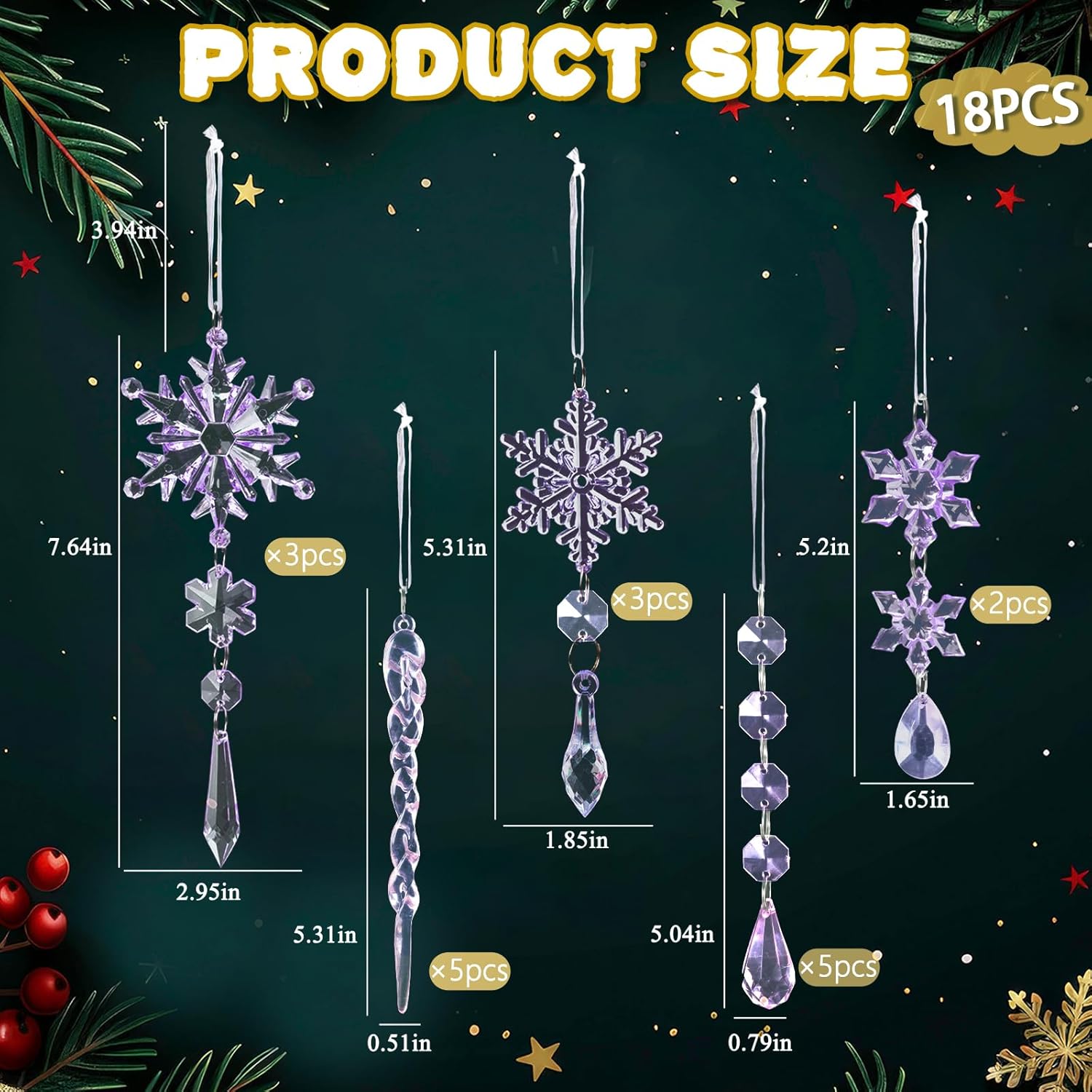 18pcs Crystal Christmas Ornaments for Christmas Tree Decorations-Purple Hanging Acrylic Snowflake and Icicle Ornaments with Drop Pendants for New Year Party Decorations Supplies