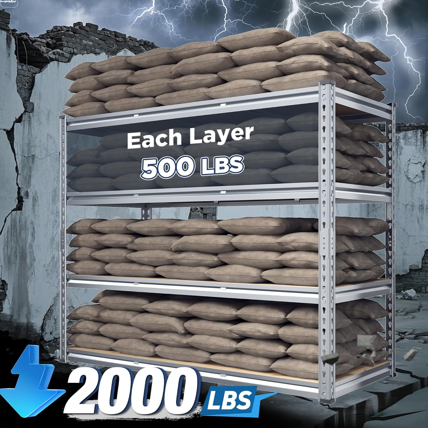 • 【Garage Shelving - 2000LBS Capacity】REIBII garage shelves are built like a tank! Thick steel legs and chunky boards can carry 500lbs on each shelf – that's 2000lbs total! Suit for stacking toolboxes, car parts, or even your camping gear. No wobbling, no bending, just rock-solid storage