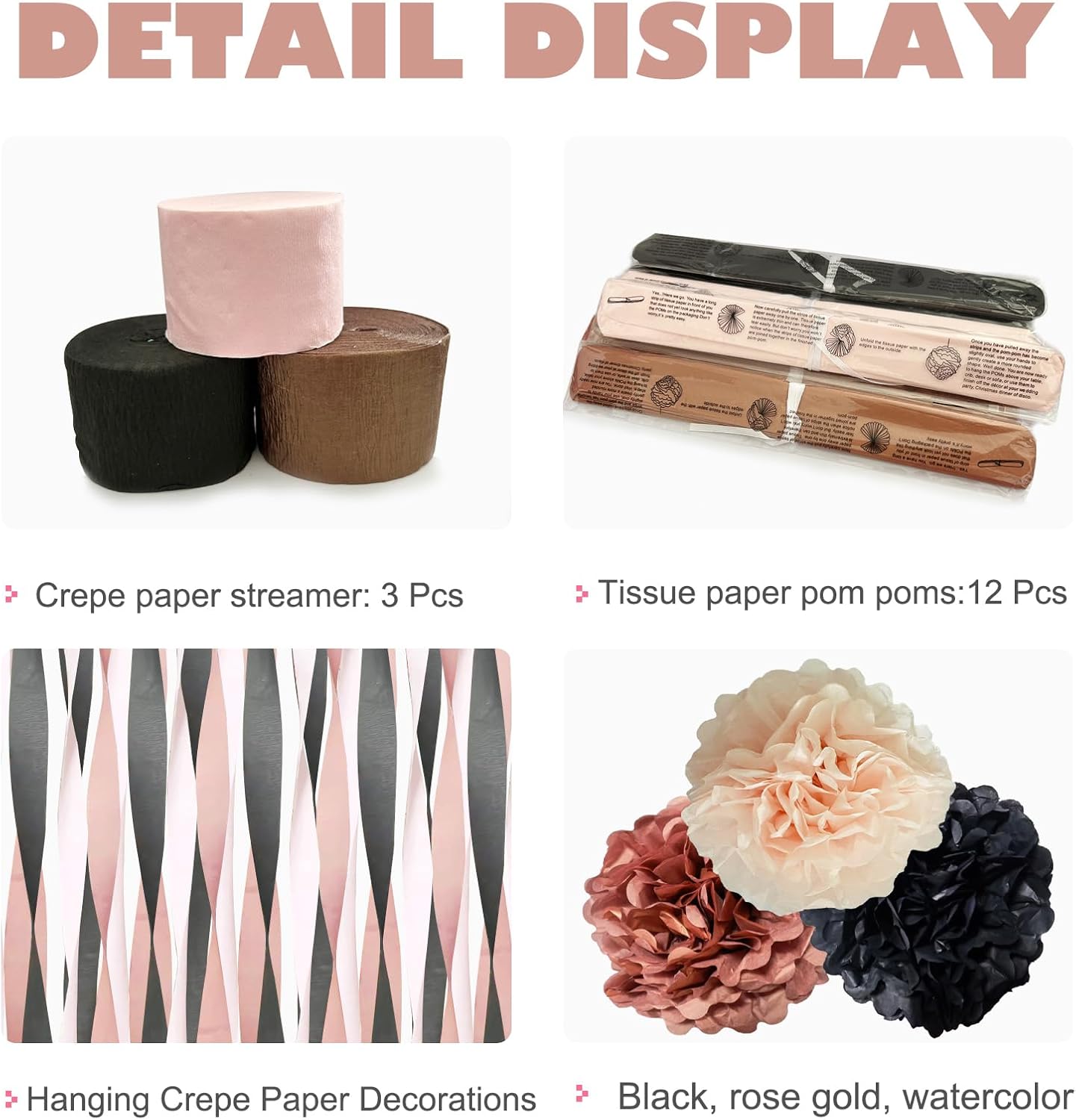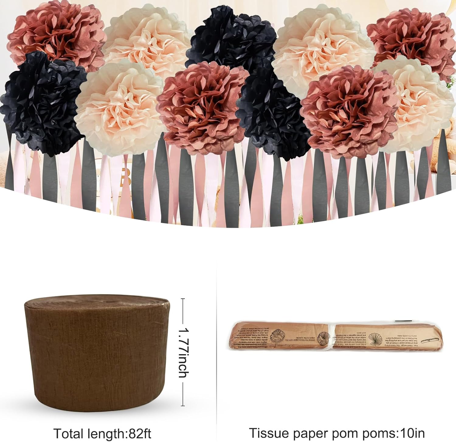 • PERFECT SIZE - 12 dreamy paper pompoms are 10 inches in size, and the tassel streamers are 25m in one roll, with 3 rolls in total, 75m in total.