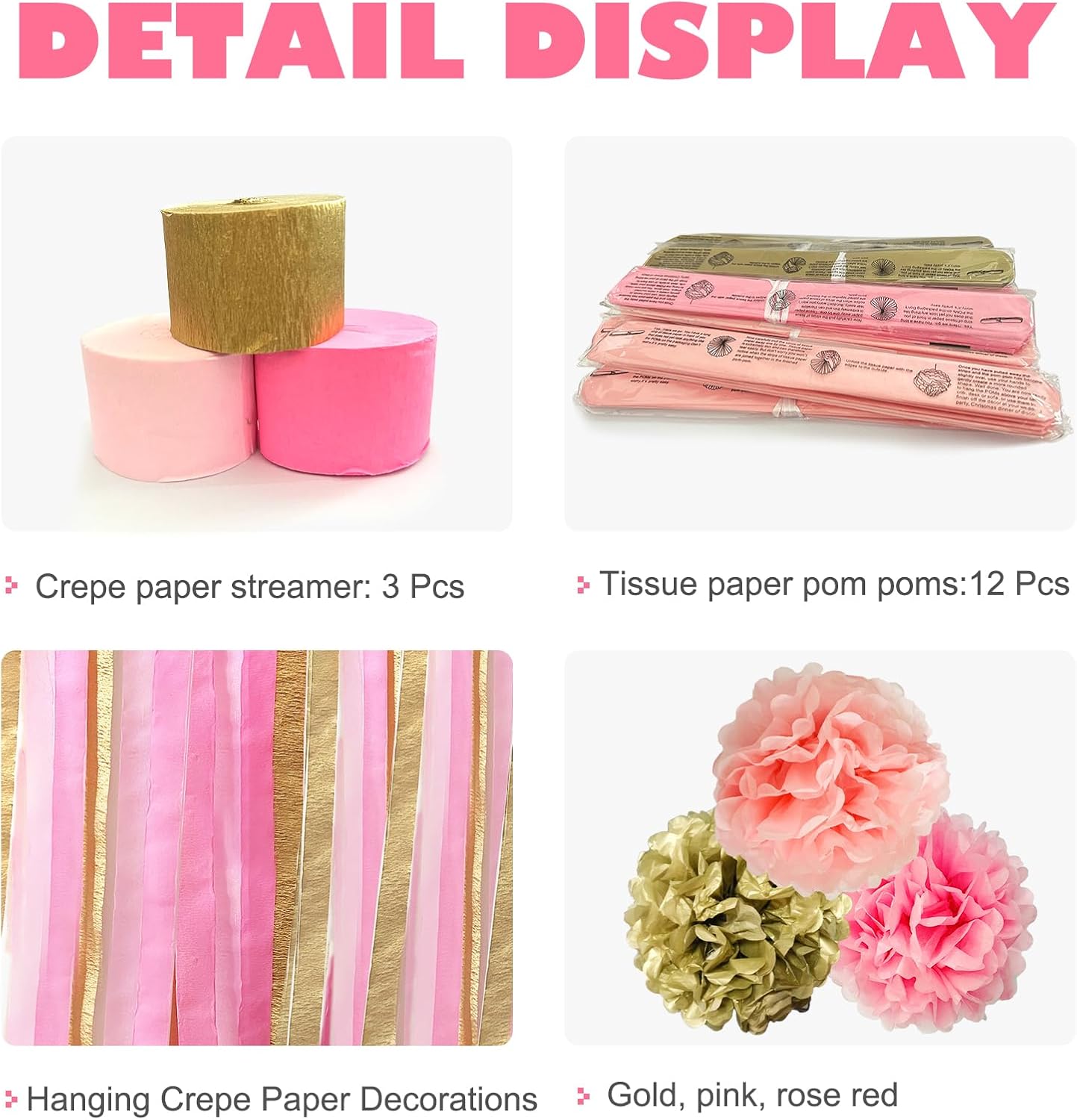 • PERFECT SIZE - 12 dreamy paper pompoms are 10 inches in size, and the tassel streamers are 25m in one roll, with 3 rolls in total, 75m in total.