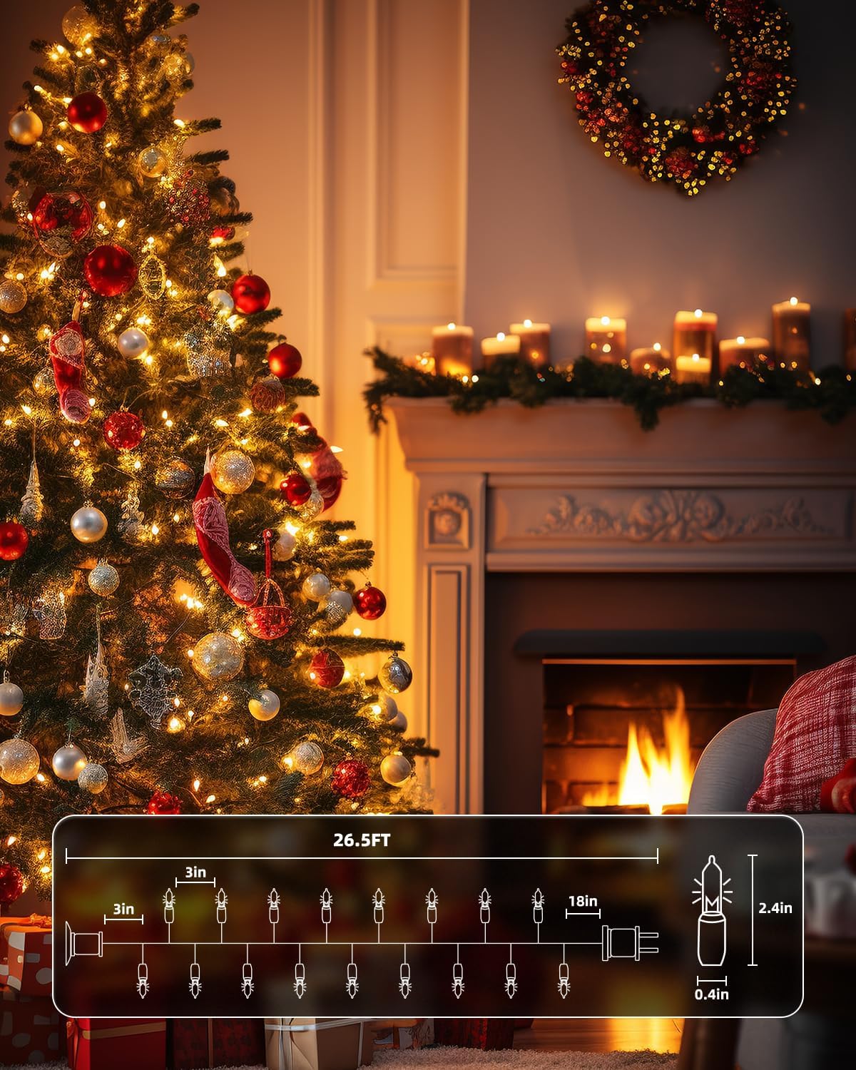 • 【Festive Mini Christmas Lights Set】This set includes 100 transparent incandescent mini-lights on 26.5 ft white wire, with bulbs spaced 3-inche apart and 18-inch lead wire. Perfect for holiday decorating, with the ability to connect up to 5 light strings end-to-end;