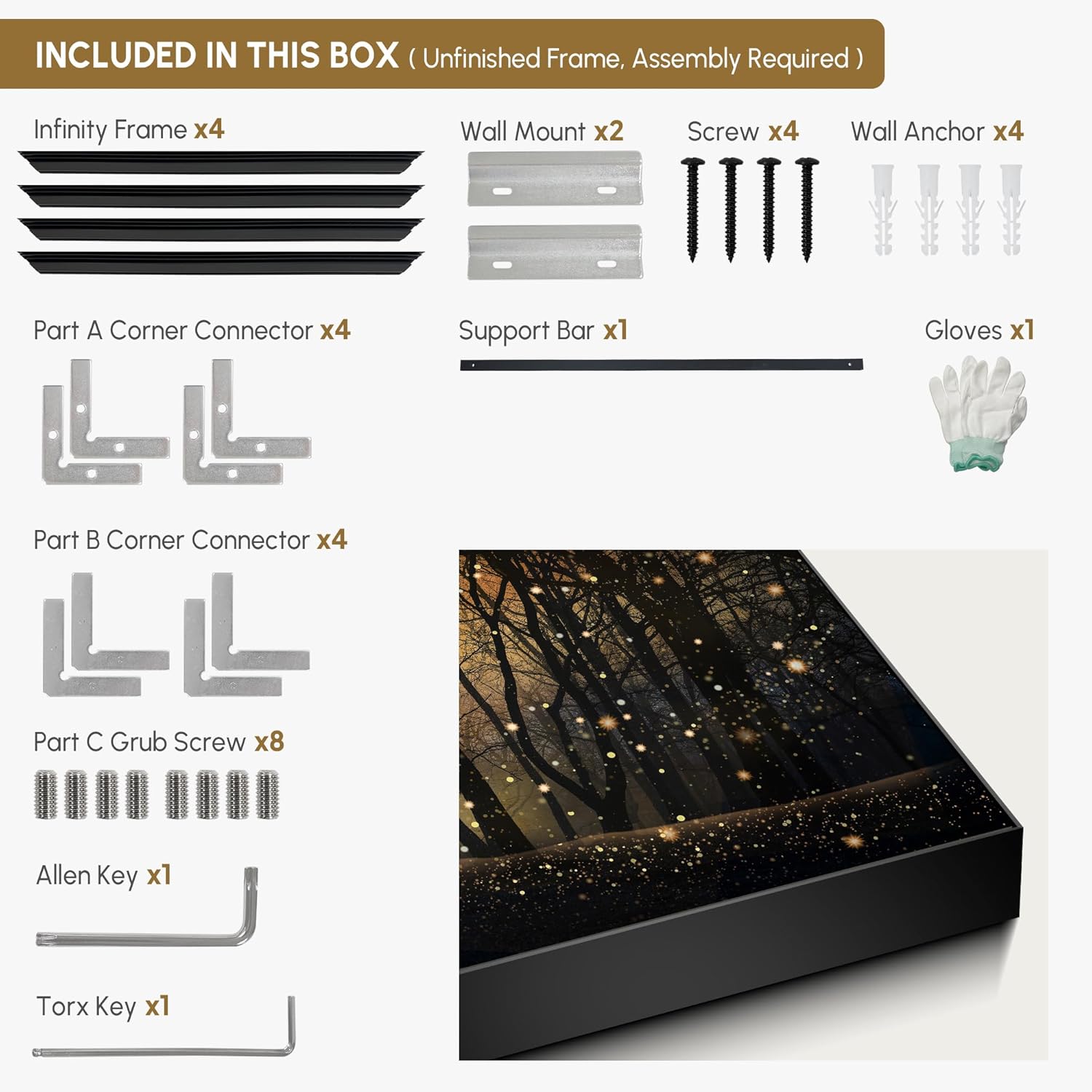 • Assembly Required: The artwork comes with the frame components unassembled. Don’t worry — setup is straightforward and tool-friendly. For best results and accurate alignment, we recommend two people to ensure a smooth assembly and a stable, secure wall mount.