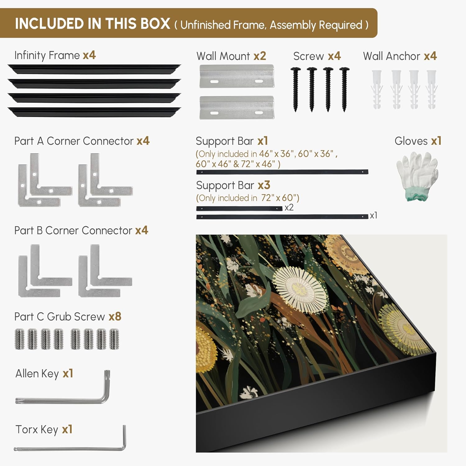 • Assembly Required: The artwork comes with the frame components unassembled. Don’t worry — setup is straightforward and tool-friendly. For best results and accurate alignment, we recommend two people to ensure a smooth assembly and a stable, secure wall mount.
