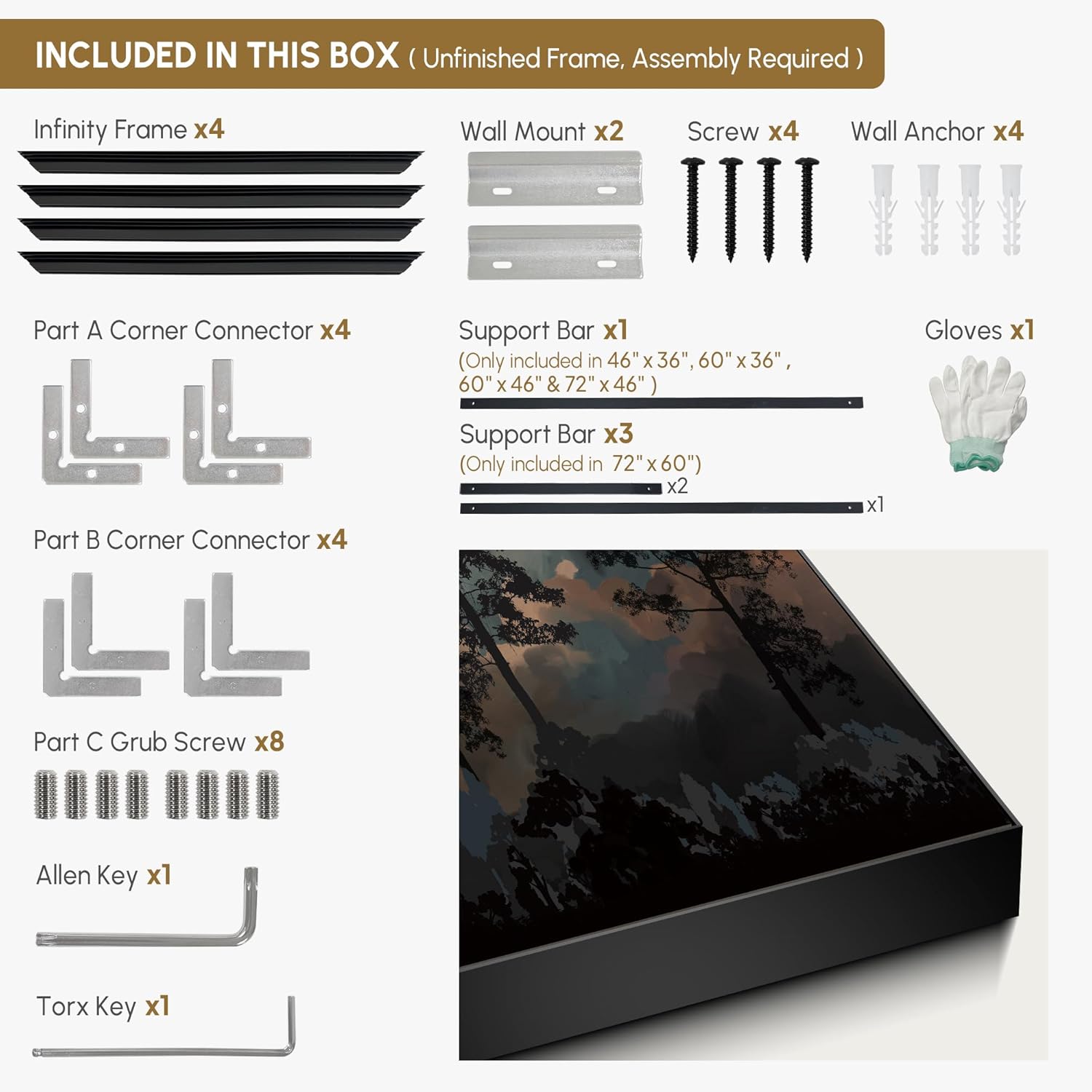 • Assembly Required: The artwork comes with the frame components unassembled. Don’t worry — setup is straightforward and tool-friendly. For best results and accurate alignment, we recommend two people to ensure a smooth assembly and a stable, secure wall mount.