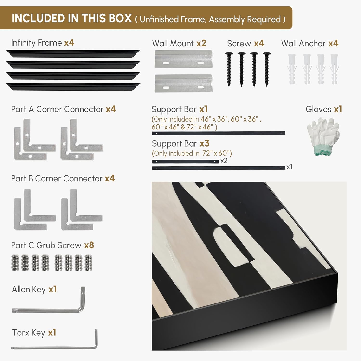 • Assembly Required: The artwork comes with the frame components unassembled. Don’t worry — setup is straightforward and tool-friendly. For best results and accurate alignment, we recommend two people to ensure a smooth assembly and a stable, secure wall mount.
