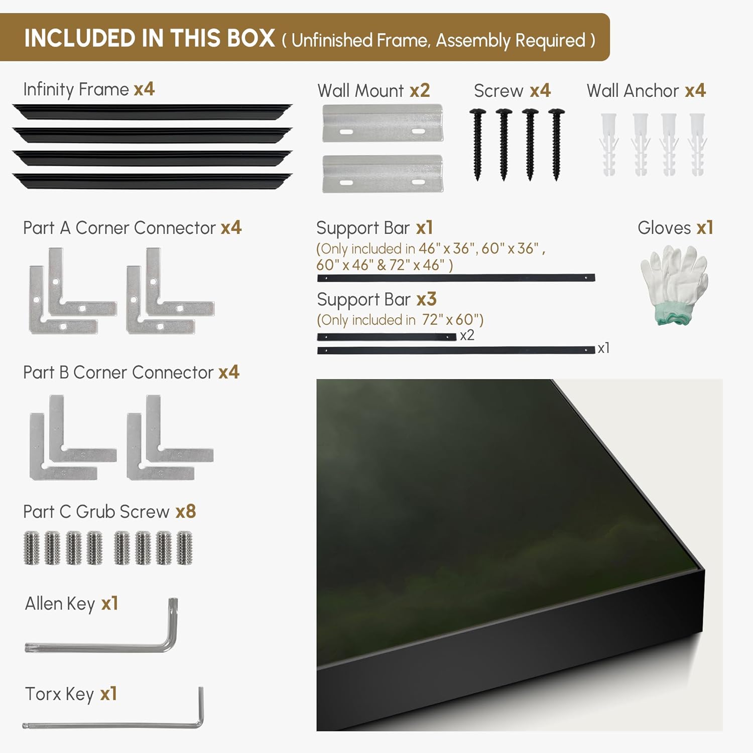 • Assembly Required: The artwork comes with the frame components unassembled. Don’t worry — setup is straightforward and tool-friendly. For best results and accurate alignment, we recommend two people to ensure a smooth assembly and a stable, secure wall mount.