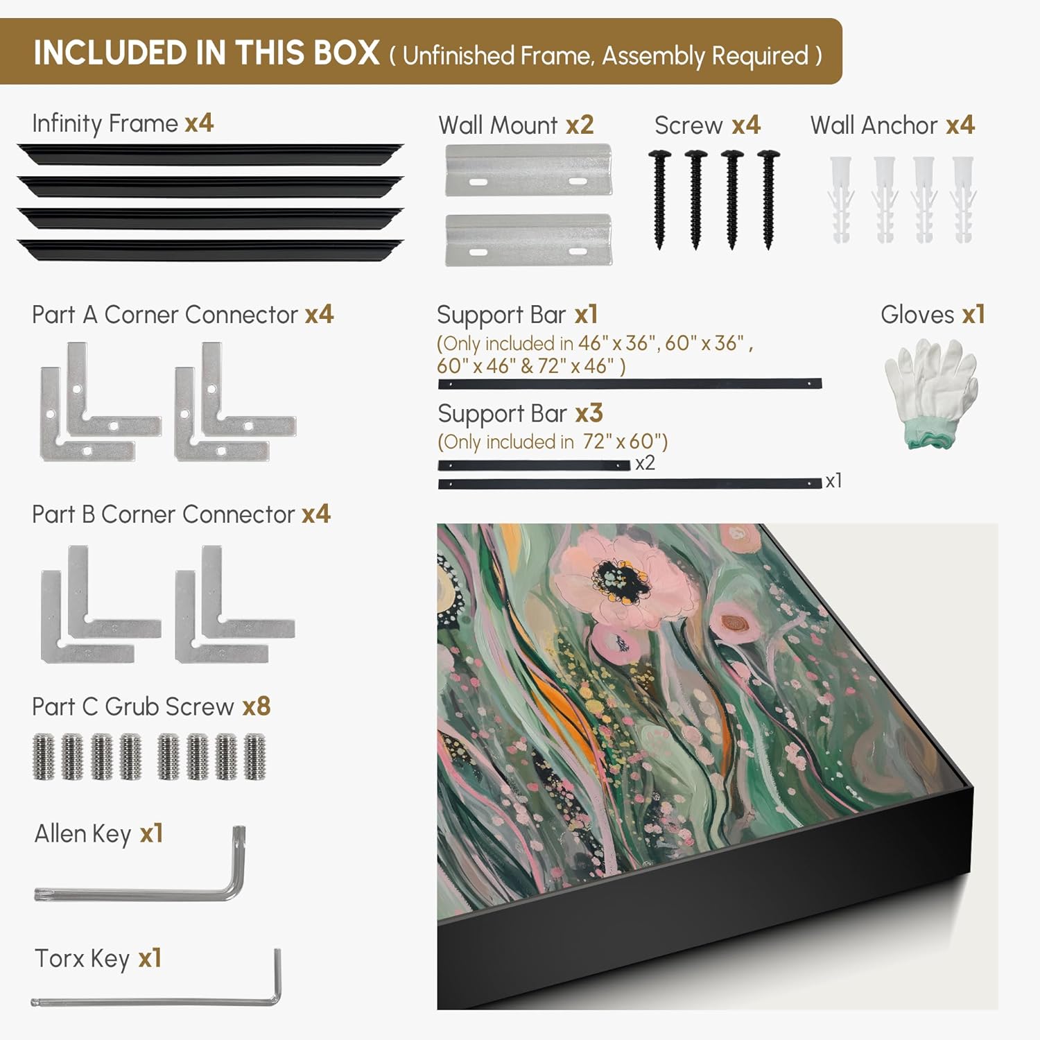 • Assembly Required: The artwork comes with the frame components unassembled. Don’t worry — setup is straightforward and tool-friendly. For best results and accurate alignment, we recommend two people to ensure a smooth assembly and a stable, secure wall mount.