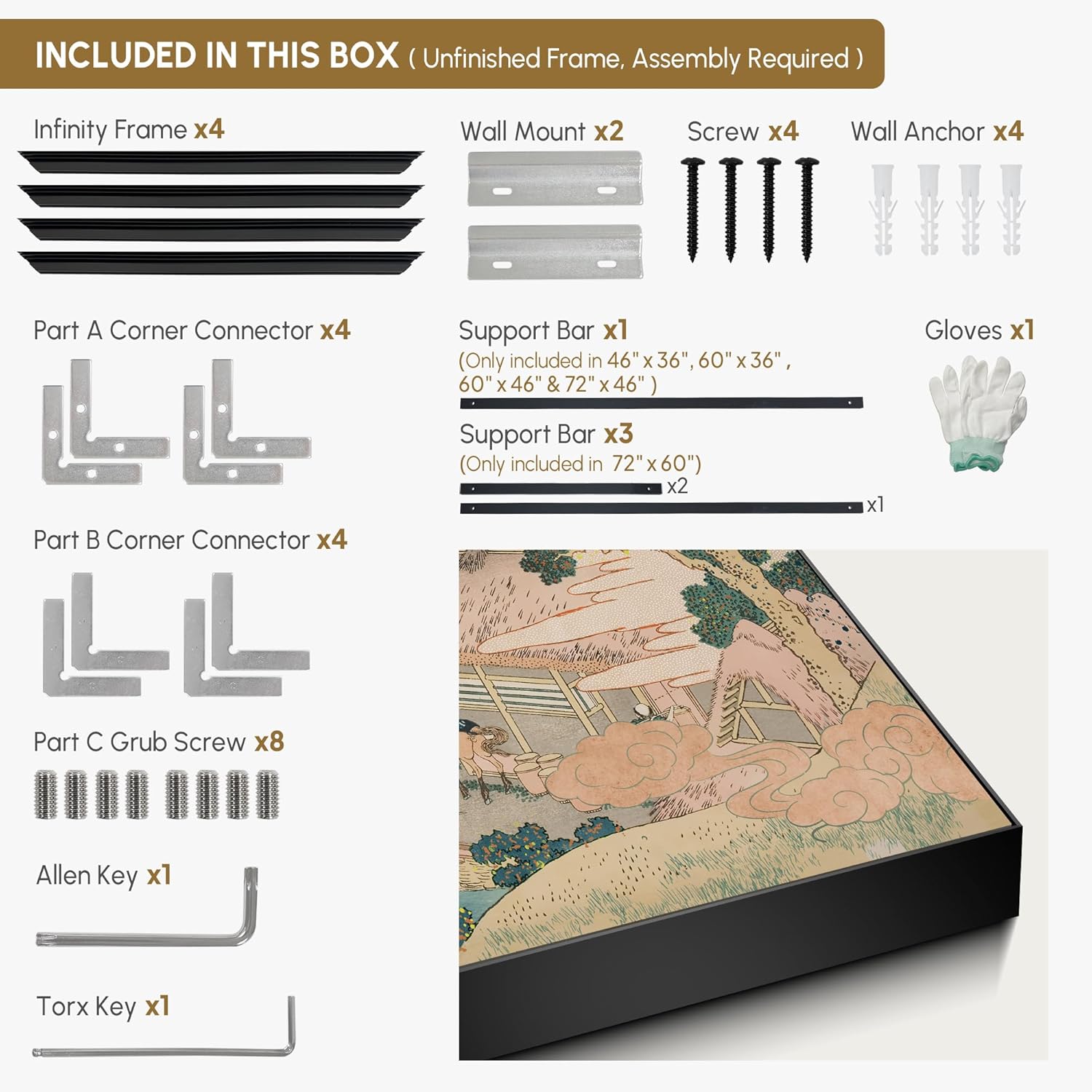 • Assembly Required: The artwork comes with the frame components unassembled. Don’t worry — setup is straightforward and tool-friendly. For best results and accurate alignment, we recommend two people to ensure a smooth assembly and a stable, secure wall mount.
