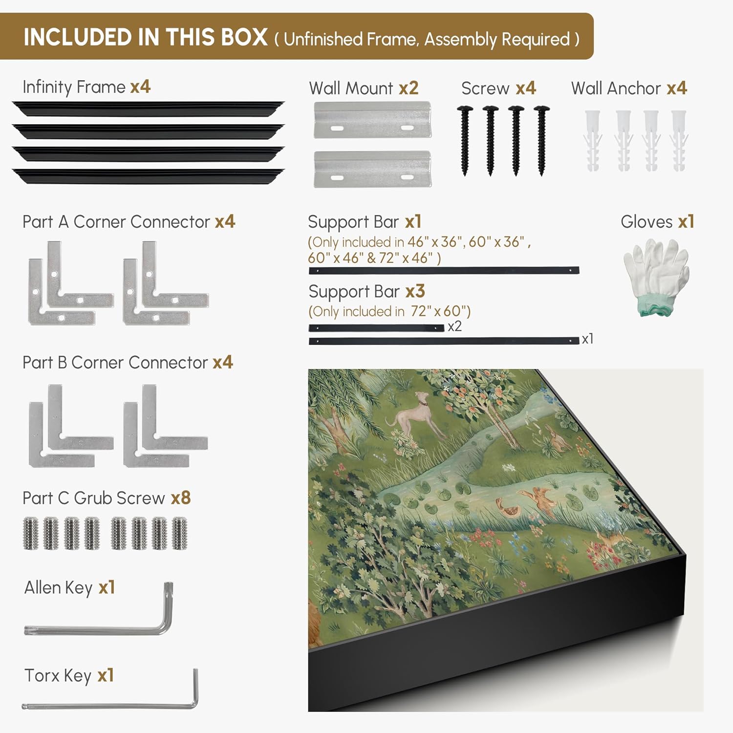 • Assembly Required: The artwork comes with the frame components unassembled. Don’t worry — setup is straightforward and tool-friendly. For best results and accurate alignment, we recommend two people to ensure a smooth assembly and a stable, secure wall mount.