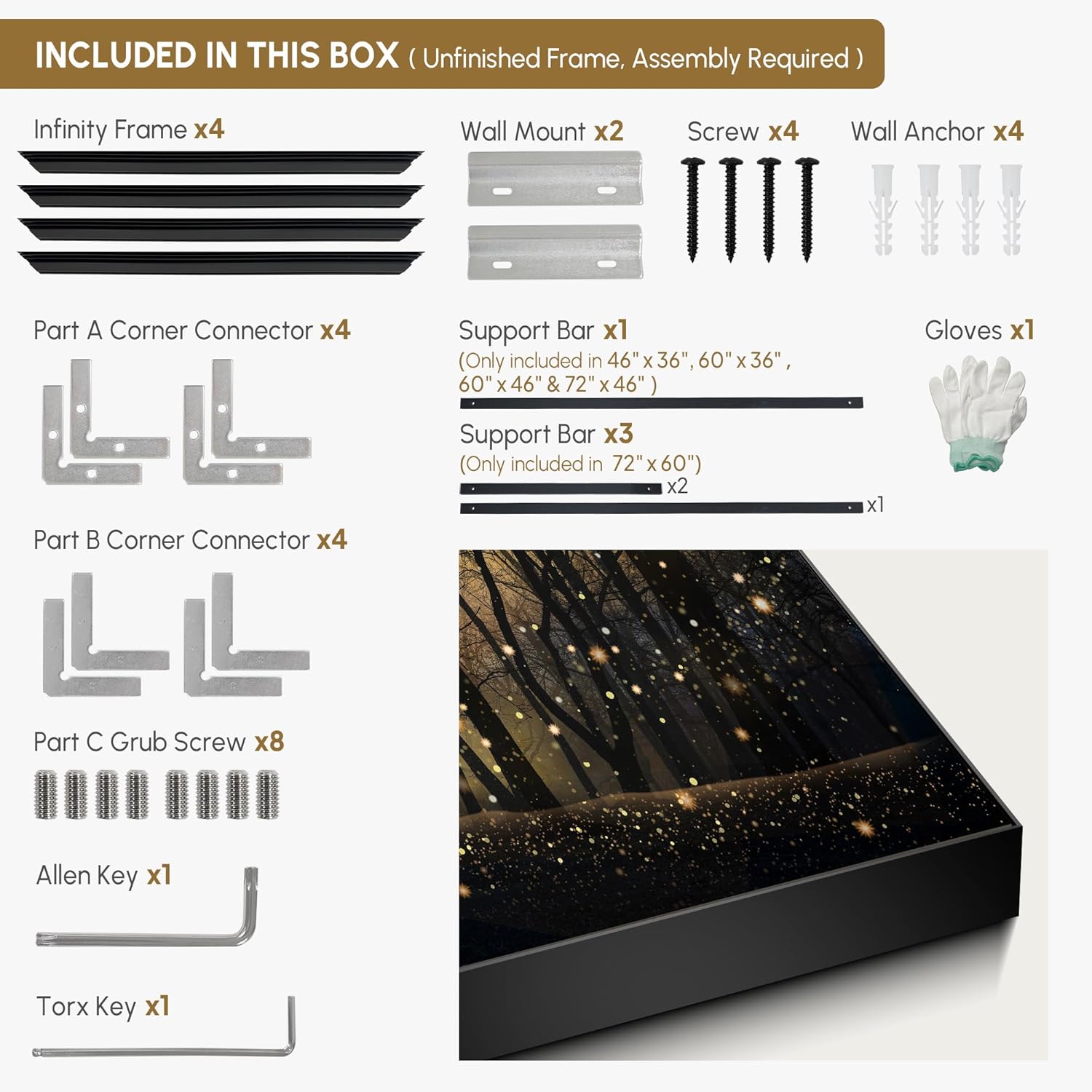 • Assembly Required: The artwork comes with the frame components unassembled. Don’t worry — setup is straightforward and tool-friendly. For best results and accurate alignment, we recommend two people to ensure a smooth assembly and a stable, secure wall mount.