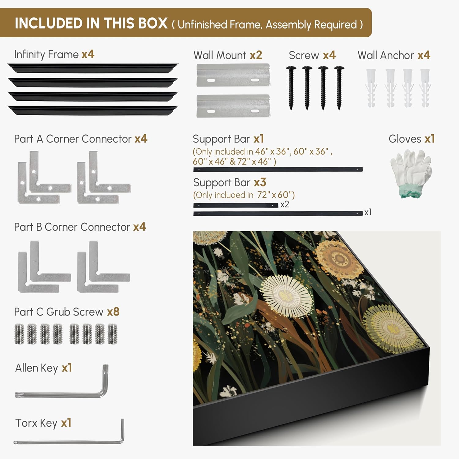 • Assembly Required: The artwork comes with the frame components unassembled. Don’t worry — setup is straightforward and tool-friendly. For best results and accurate alignment, we recommend two people to ensure a smooth assembly and a stable, secure wall mount.