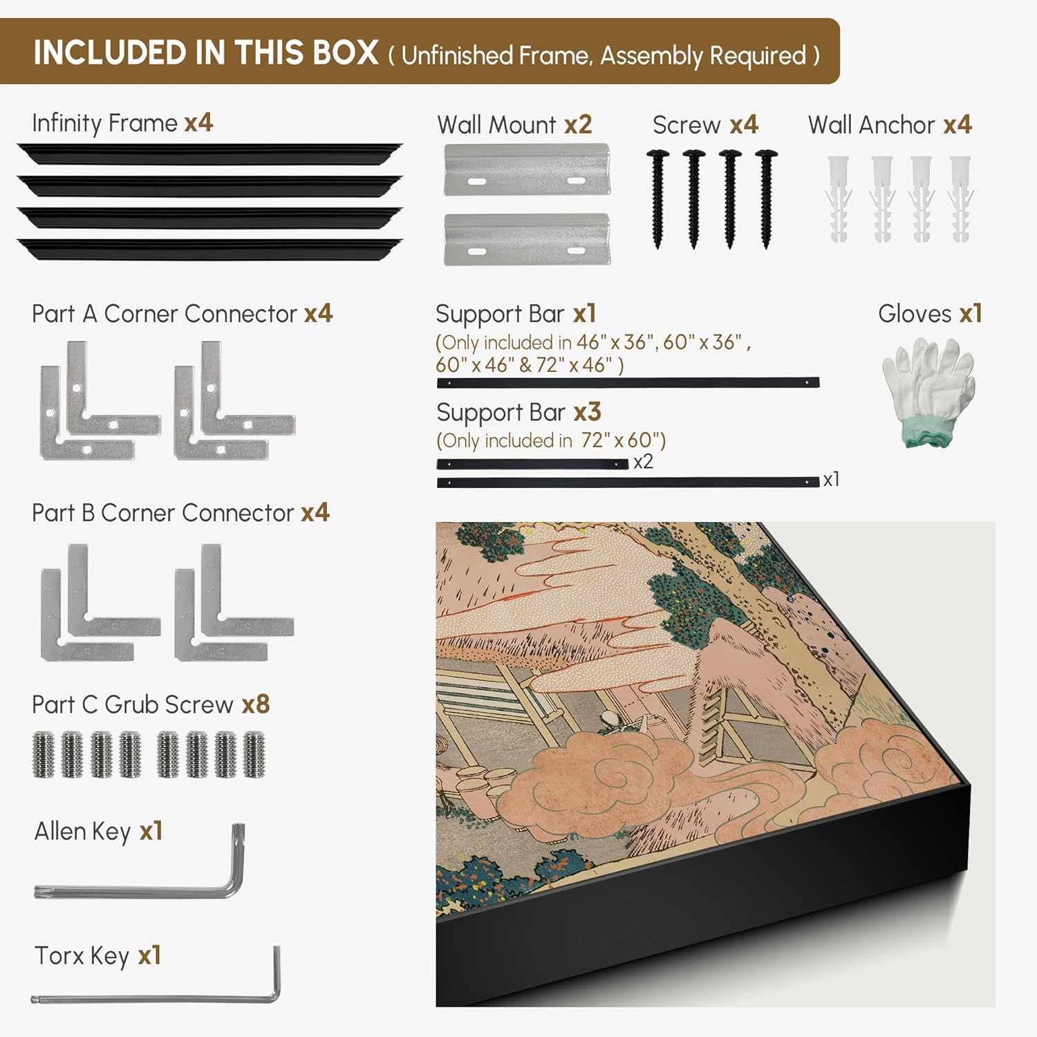 • Assembly Required: The artwork comes with the frame components unassembled. Don¡¯t worry ¡ª setup is straightforward and tool-friendly. For best results and accurate alignment, we recommend two people to ensure a smooth assembly and a stable, secure wall mount.