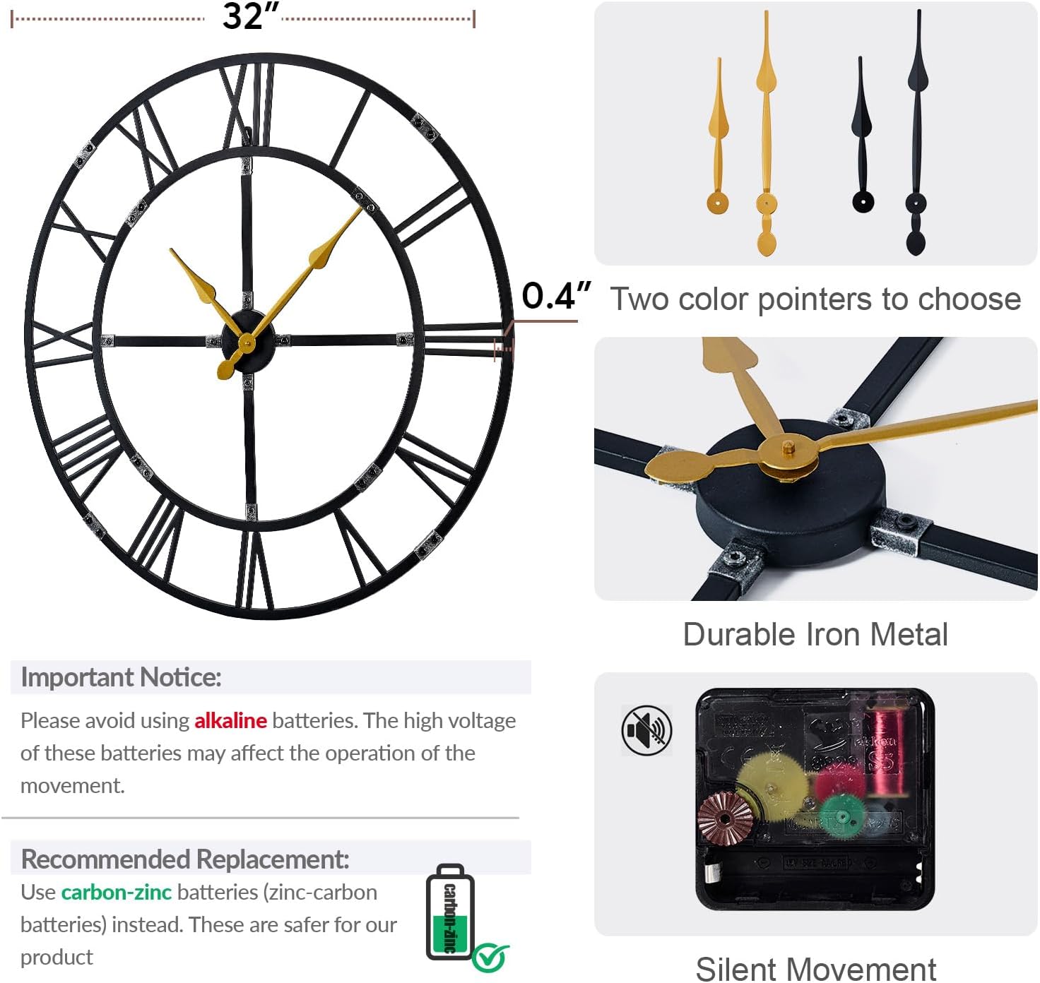 • Important: Avoid using alkaline, lithium battery or high-power batteries, as they may affect the clock movement. Use carbon-zinc (zinc-carbon) batteries instead for best performance. Note: Batteries are not included.