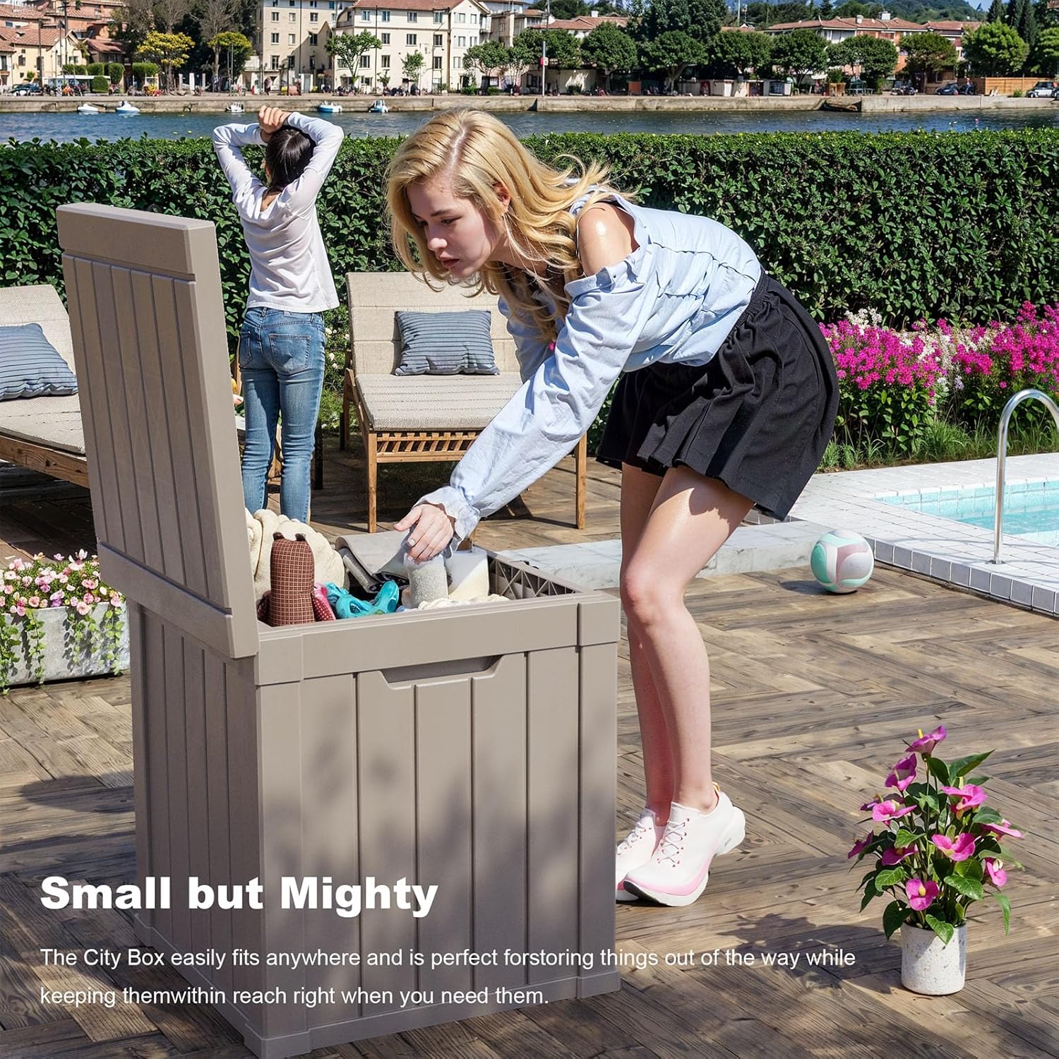• BEAUTY MEETS DURABILITY: Featuring an aggregate resin with a wood grain pattern, this deck box offers an appealing look coupled with robust protection. It's resistant to water, UV rays, fading, rust, peeling, and warping, making maintenance nearly unnecessary for the coming years