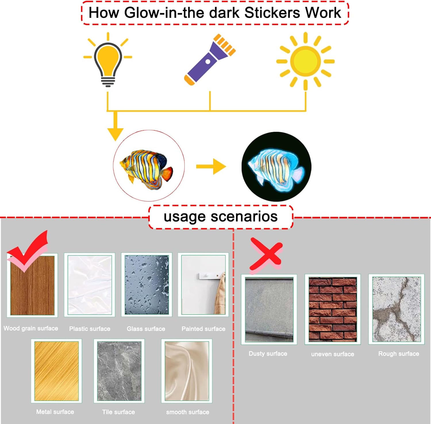 • Before Use: These underwater ceiling wall stickers are made of high-quality luminous material. They glow brightly after absorbing sufficient light during the day. After charging in daylight, they emit a soft glow at night for 8–15 hours. We recommend exposing them to room light, sunlight, or a flashlight for 10–30 minutes for optimal results. For best performance, place them close to light sources.