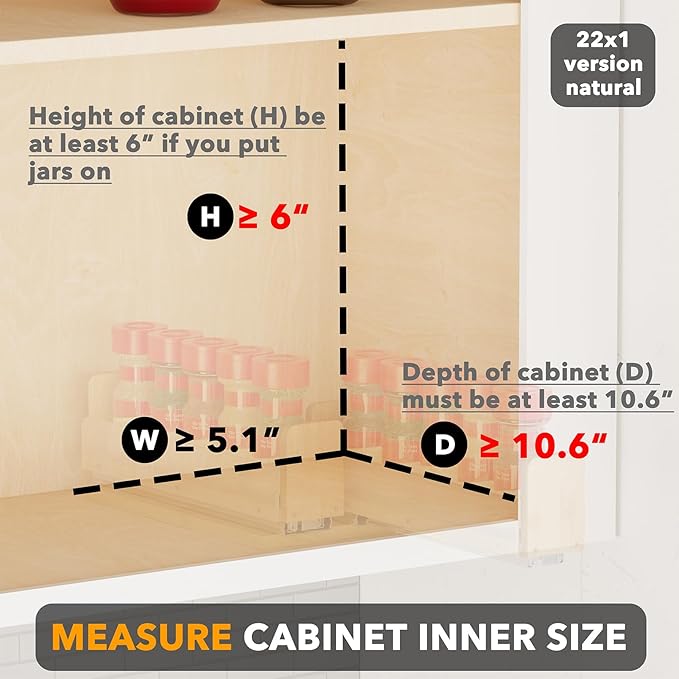 • HEAVY-DUTY SPICE RACK FOR CABINET - Smooth ball bearing glides allow easy sliding; Full extension rails give complete access to all your spices in kitchen upper cabinets; Bottom panel clears any cabinet lip for a perfect fit