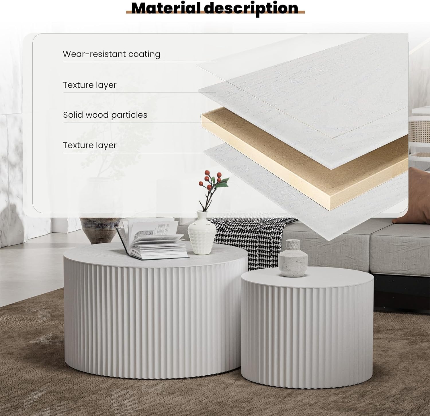 • [Timeless Aesthetic, Effortless Elegance] Designed with a sleek round silhouette and a chic beige textured finish, this nesting table set complements modern, industrial, farmhouse, and luxury interiors alike. Round coffee table set of 2 a statement piece that always feels right at home!