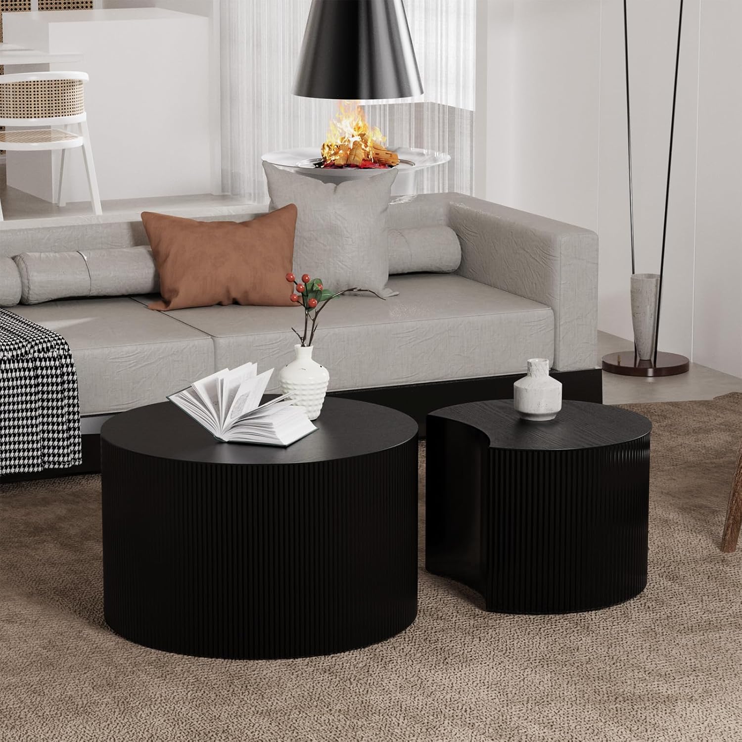 Round Nesting Coffee Table, Drum Wood Coffee Table Set of 2 Black, Modern Fluted Nesting Tables Circle Center Table 2 Piece for Small Spaces Living Room Bedroom Balcony Office, No Assembling